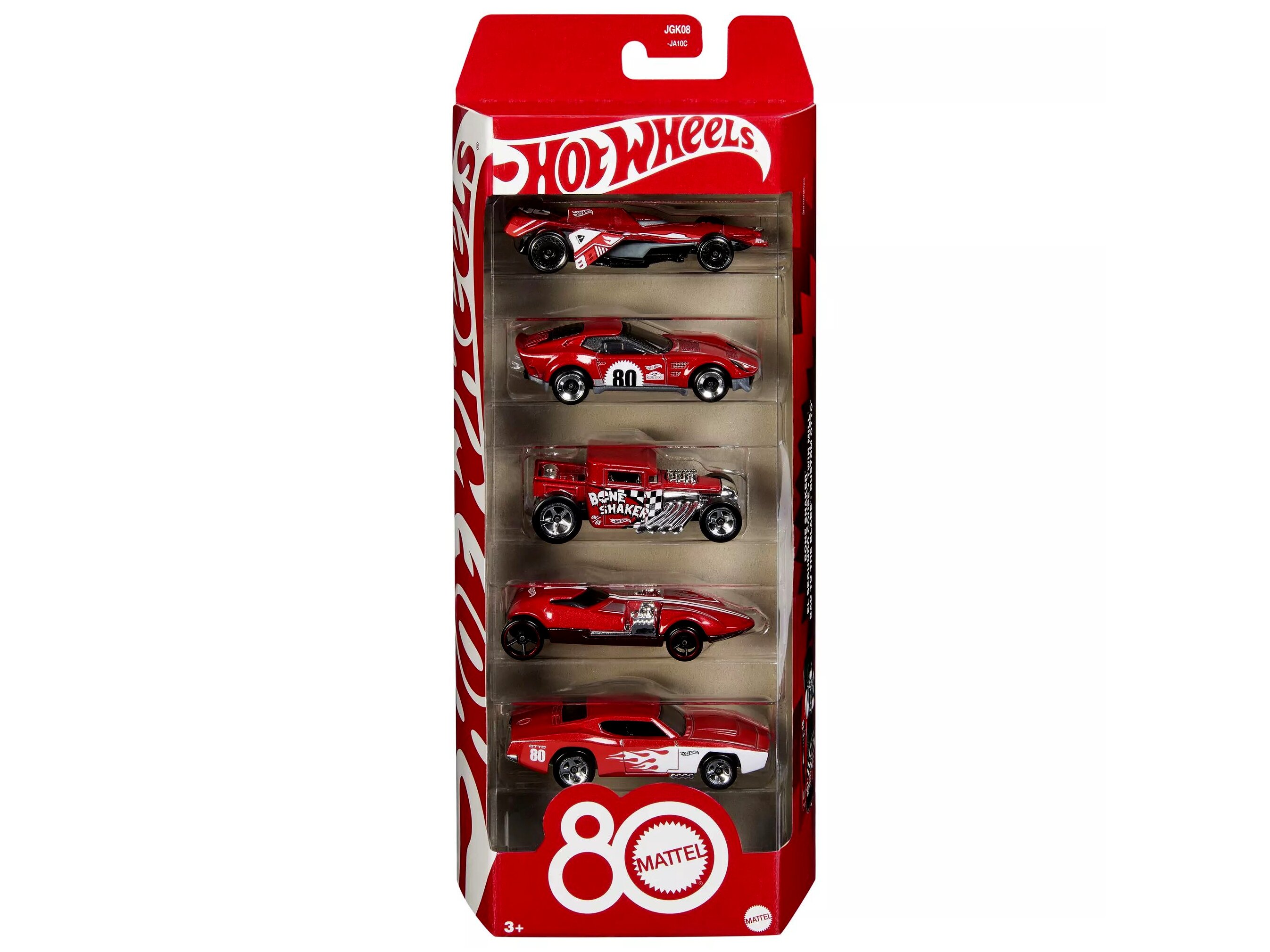 Csobbanj bele a Hot Wheels izgalmas világába a Mattel 80. évforduló alkalmából készült kisautókkal! A szett öt különlegesen festett és autentikus részletekkel kidolgozott autót tartalmaz, melyek között ikonikus modellek is megtalálhatóak, mint a Bone Shaker vagy a Twin Mill. Ezek az 1:64 méretarányú járgányok tökéletesek a gyerekek és gyűjtők számára egyaránt.