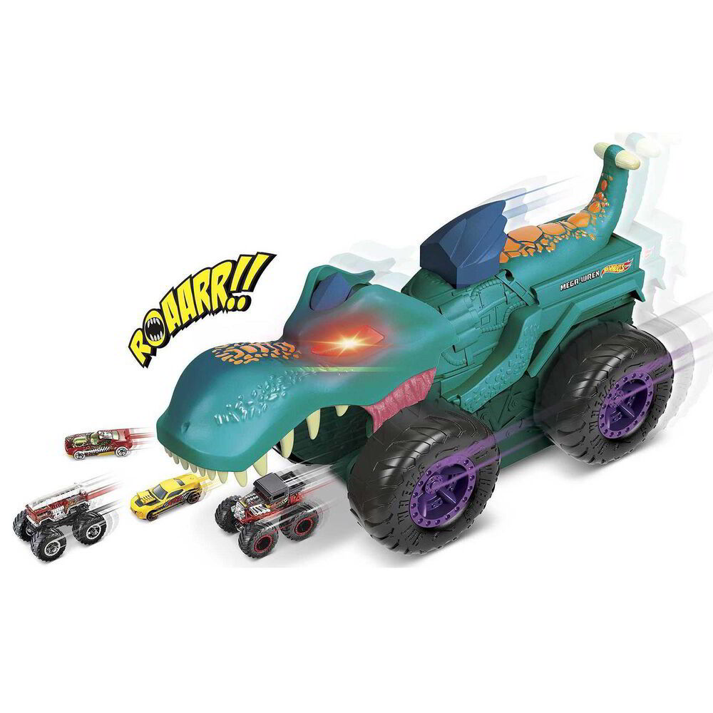 Ha az autófaló óriás utoléri a kisautókat már be is falja! Persze nincs ok a pánikra, rendszerint egy darabban jutnak ki belőle. Mehet az eddigi legmerészebb autós kaland? A Hot Wheels Mega Wrex készlet egy kisautót is tartalmaz. A színek és díszítések eltérhetnek. A játék 3 darab AA típusú elemmel működik, amelyet a csomag tartalmaz. Csomagolási méret: 46 x 21 x 26 cm.