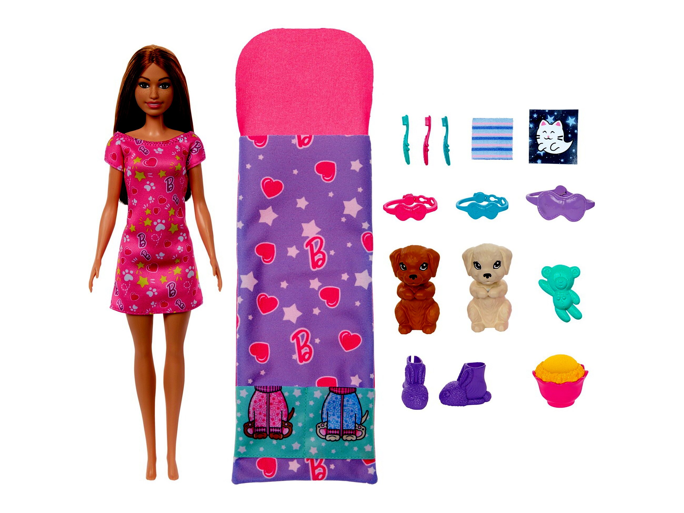 Barbie rendkívül kényelmes pizsama öltözetben és bolyhos papucsokban érkezik, készen áll a mesemondásra és álomvilág felfedezésére. Amikor eljön az elalvás ideje, Barbie és két kis kedvence együtt húzhatnak be a közös hálózsákba, amely teljessé teszi az éjszakai kalandot.