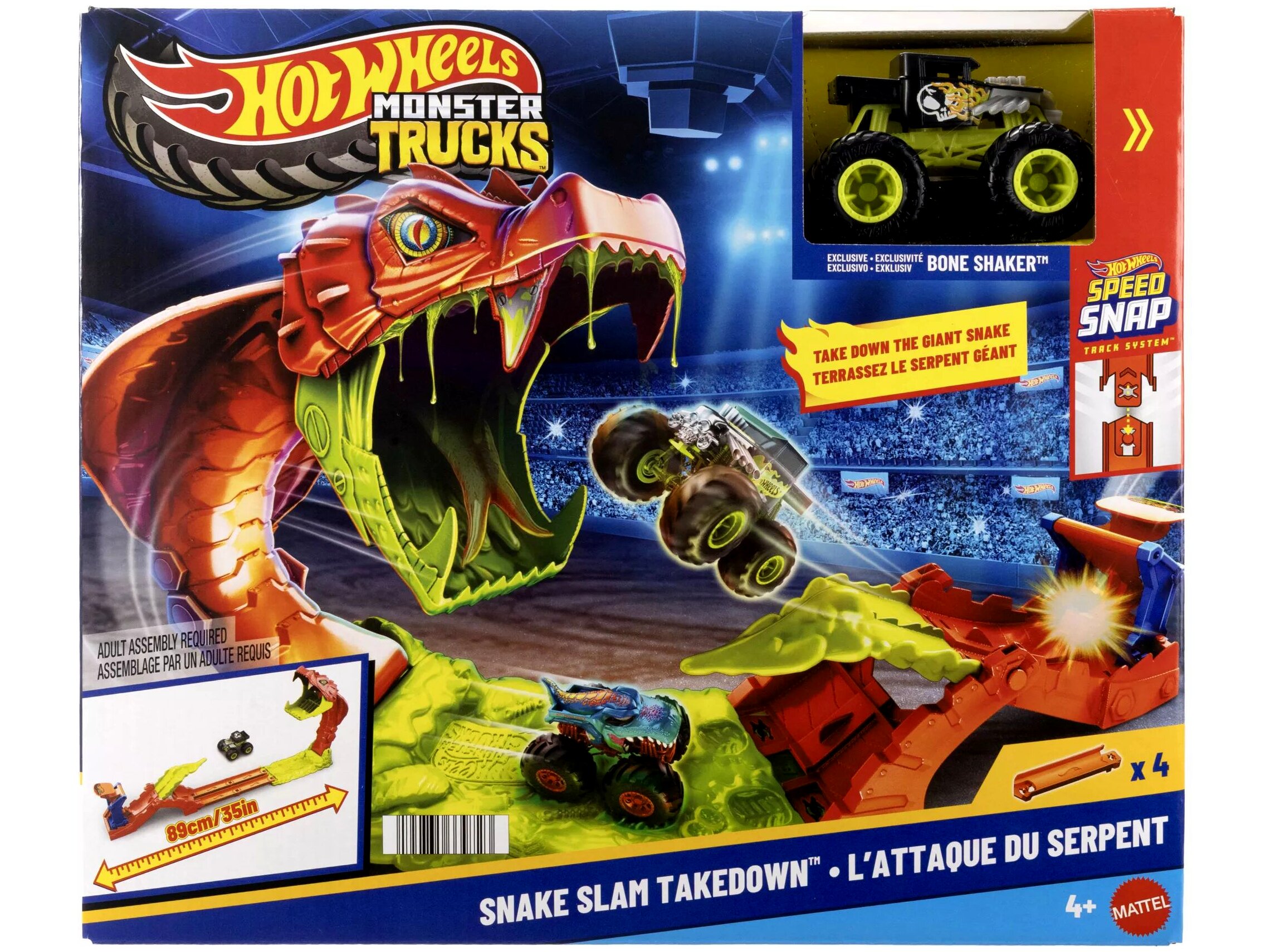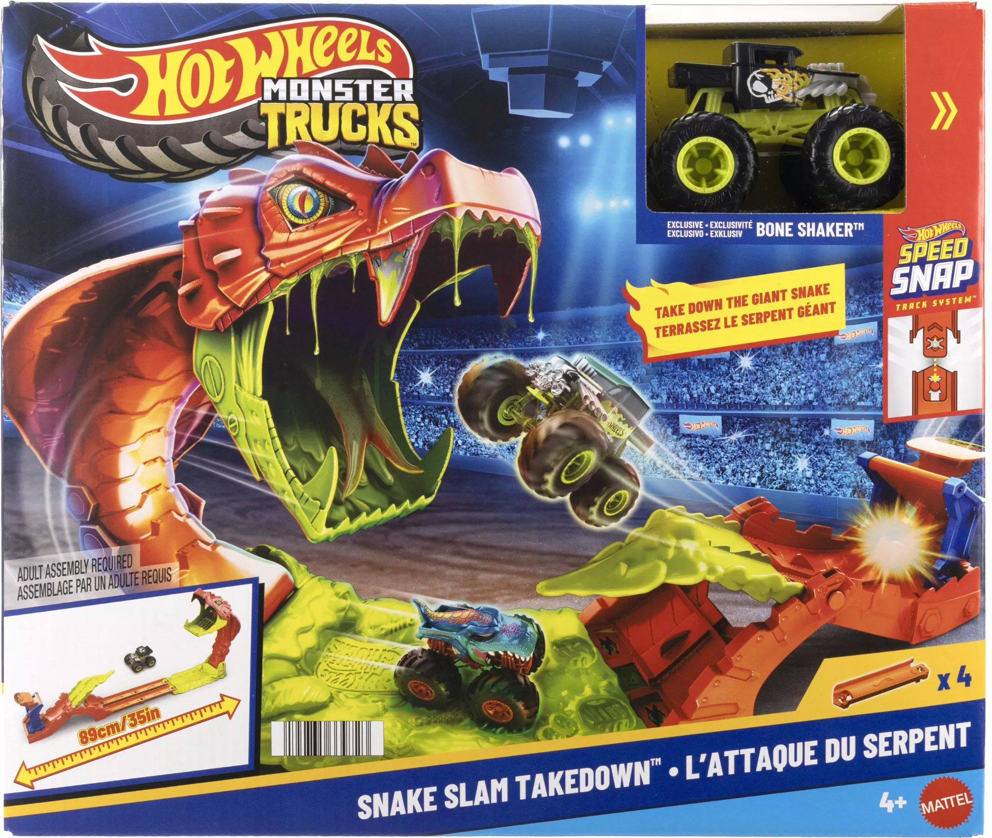 Fedezd fel a száguldás, az ütközések és a látványos kaszkadőrmutatványok világát ezzel a különleges Hot Wheels Monster Trucks pályaszettel! A gyerekek egy félelmetes, kígyó ihlette akadálypályán próbálhatják ki ügyességüket, miközben egy ikonikus, 1:64 méretarányú Bone Shaker járművel küzdenek meg a pálya kihívásaival.