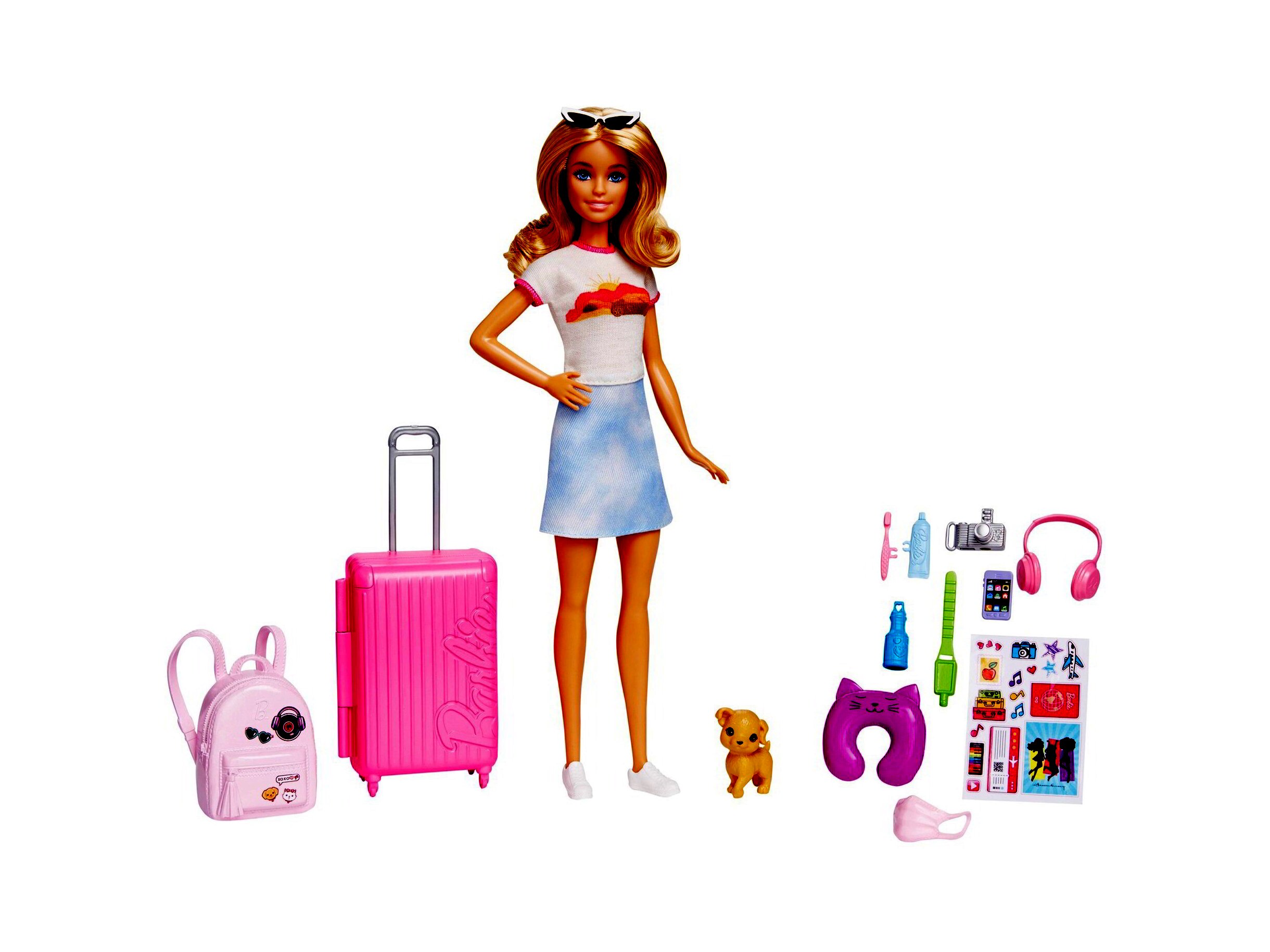 A Barbie babakészlet tartalmaz egy aranyos utazási ruhát égmintás szoknyával, és olyan tematikus kiegészítőkkel érkezik, mint a cica alakú nyakpárna, fogkefe, fejhallgató és kamera.