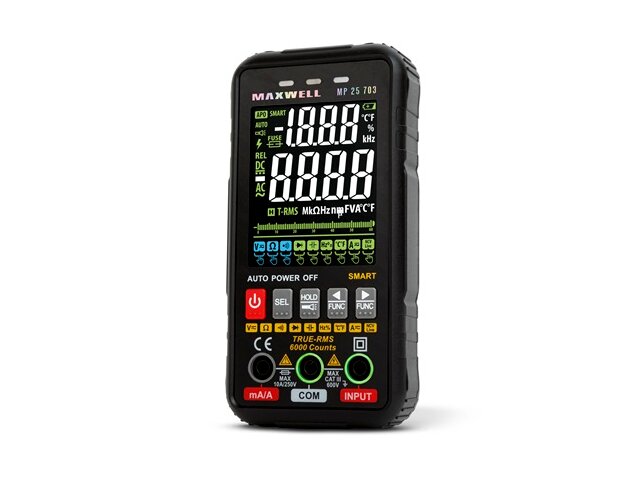 A Maxwell-Digital 25703 egy kiváló minőségű digitális multiméter, melyet nagyméretű, színes kijelzővel szereltek fel. Ezen keresztül a mért értékek könnyedén leolvashatóak, még közvetlen napsütésben is. A műszer előnye, hogy teljesen automatikusan felismeri a szükséges mérési funkciókat, ám lehetőség van kézi beállításra is. A készülék ergonomikus kialakítása végett könnyen kezelhető és kompakt méretű, így ideális választás mind a hobbielektronikai, mind a professzionális felhasználók számára.