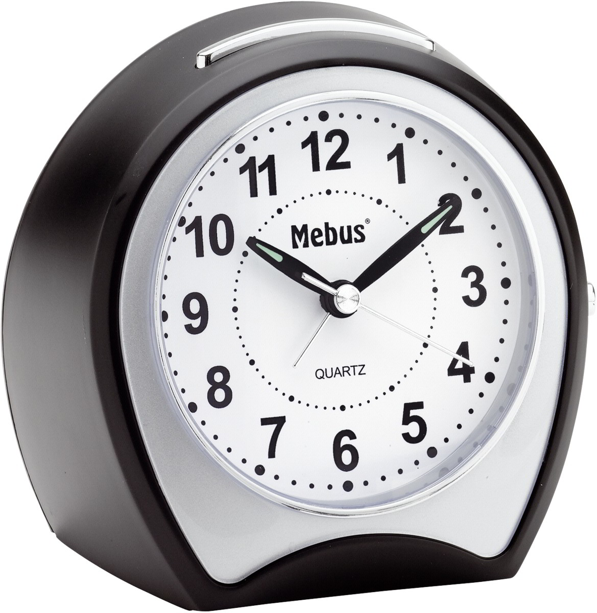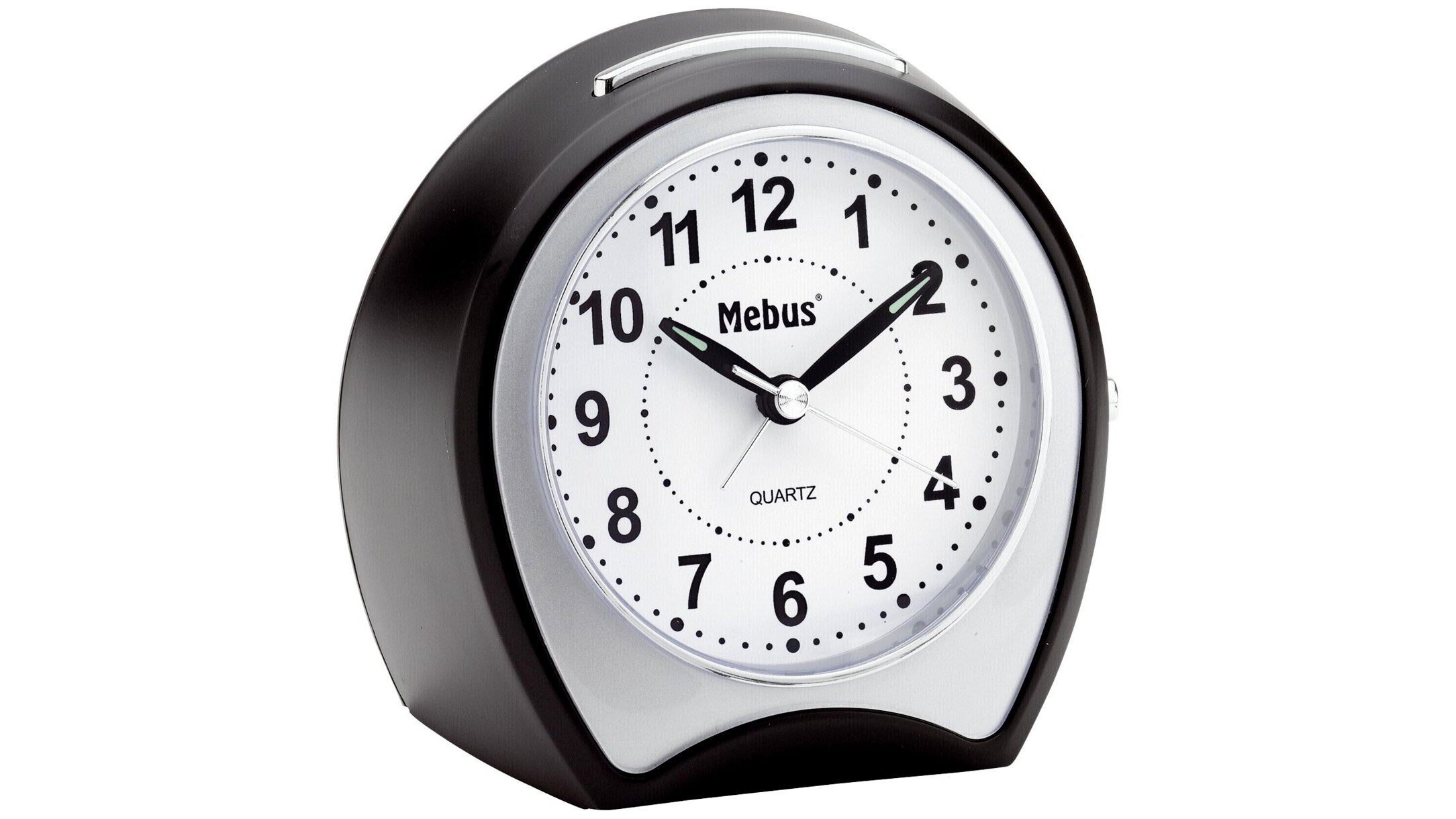 Klasszikus analóg asztali ébresztőóra, fehér számlappal.