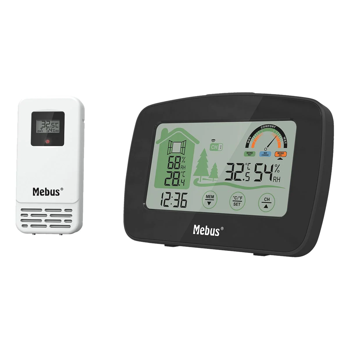 Vezeték nélküli időjárás állomás, érzékeli a beltéri és kültéri hőmérsékletet, nagy érintőkijelző LED háttérvilágítással. Asztali vagy falra szerelhető készülék, tápellátás: 5 x AAA elemmel.