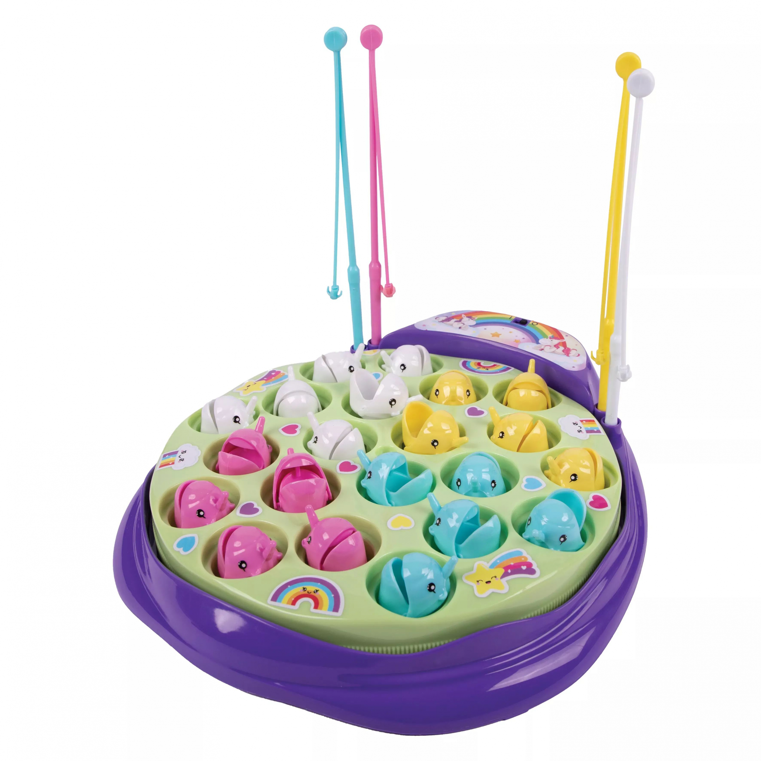 A Unikornis horgászat társasjáték tartalma: 1 forgó rét, 4 horgászbot, 21 színes unikornis, használati útmutató. Az elemek nem tartoznak a csomaghoz.