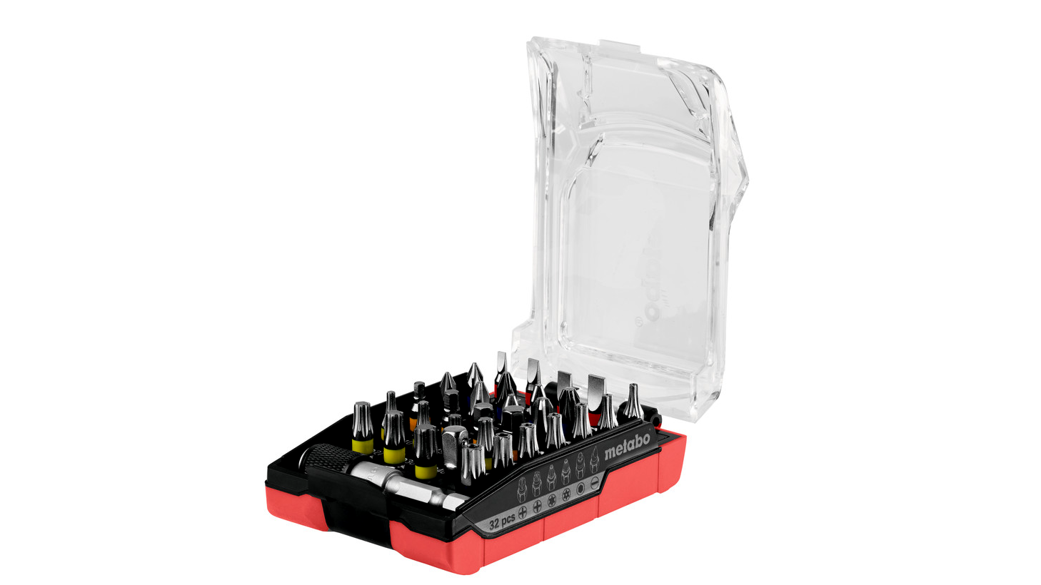 - Bitek króm-vanádium acélból (S2-Qualität); színkóddal ellátott bitek: a megfelelő bit gyors és egyszerű megtalálásához; mágneses gyorscserélő adapter; adapterrel dugóskulcsbetétekhez (dugóskulcsadapter); kiváló minőségű robusztus doboz speciális Metabo LiHD akkus megjelenéssel