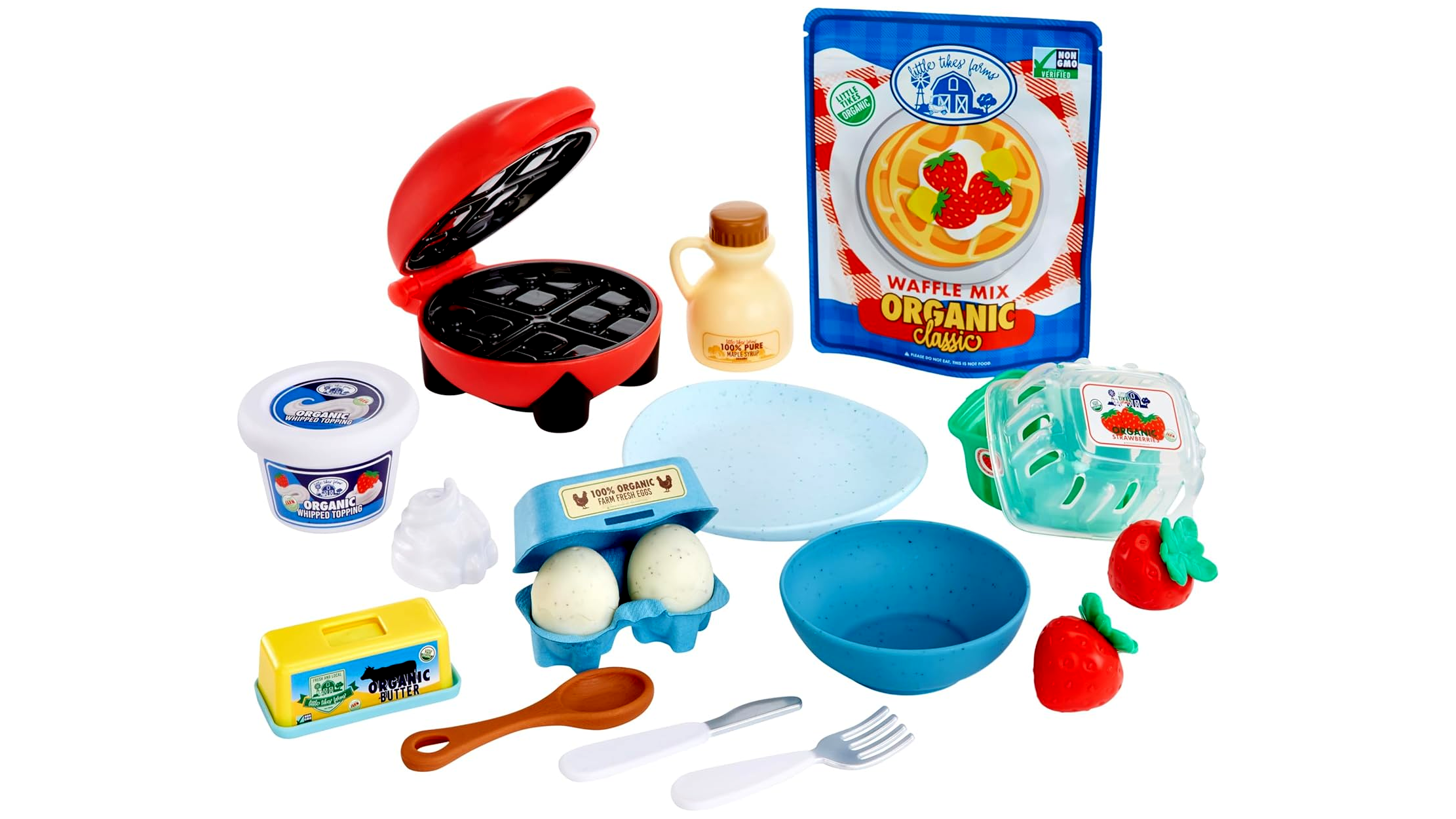 gofrikeverék Make-It! Mix játékhomokkal, vajazóforma és fedő Make-It! Mix betéttel, részletes receptkártya, gofrisütő, tejszínhabforma és tartály Make-It! Mix betéttel, tojástartó, 2 db „tojássárgája” Make-It! Mix-ből, juharszirupos üveg, epres kosár 2 db eperrel, tányér, villa, kés, tál, kanál.