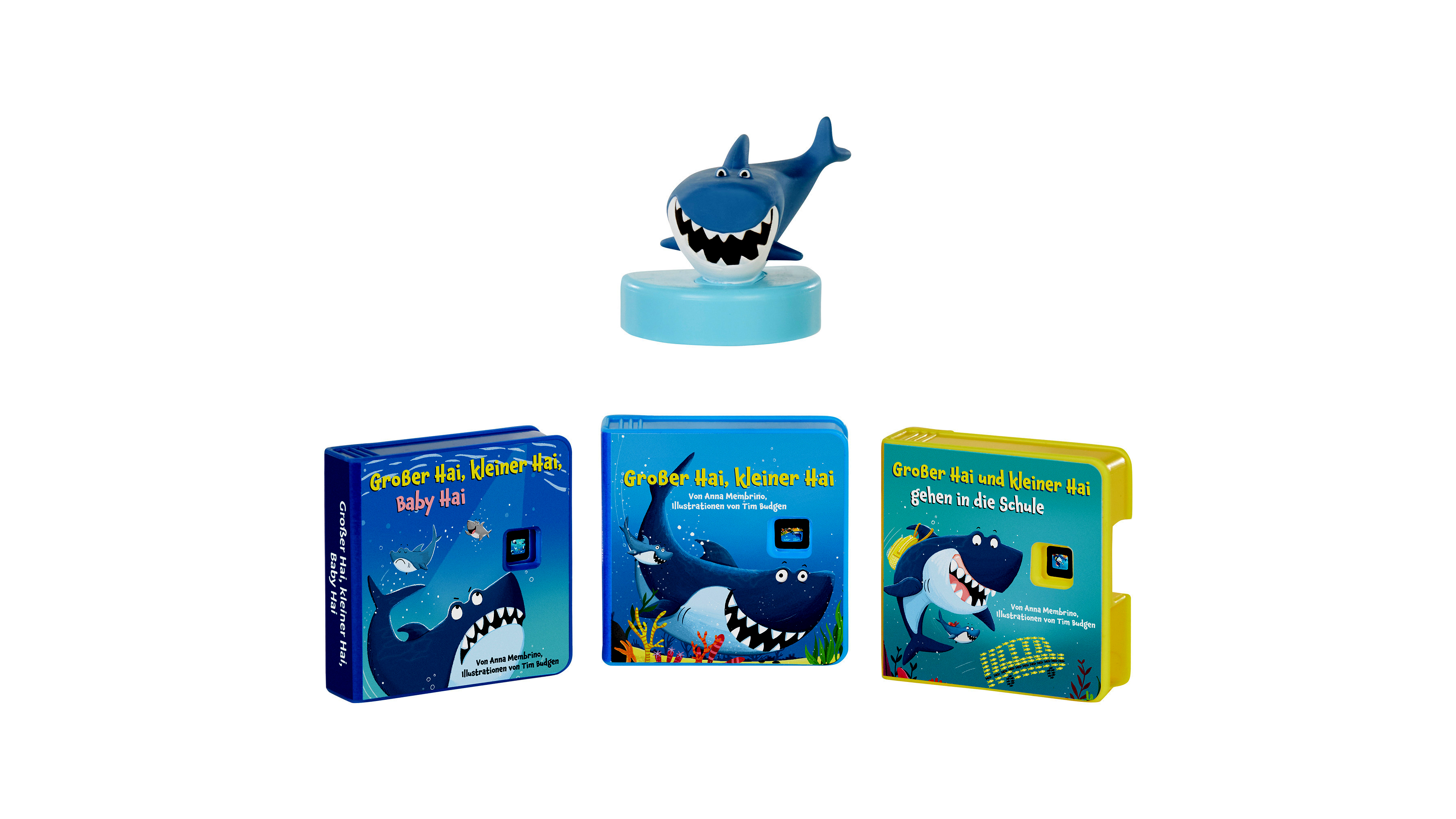 Tartalom: 3 darab történetkazetta a „Nagy cápa, Kis cápa” világából, 1 darab tematikus játékelem/figura
