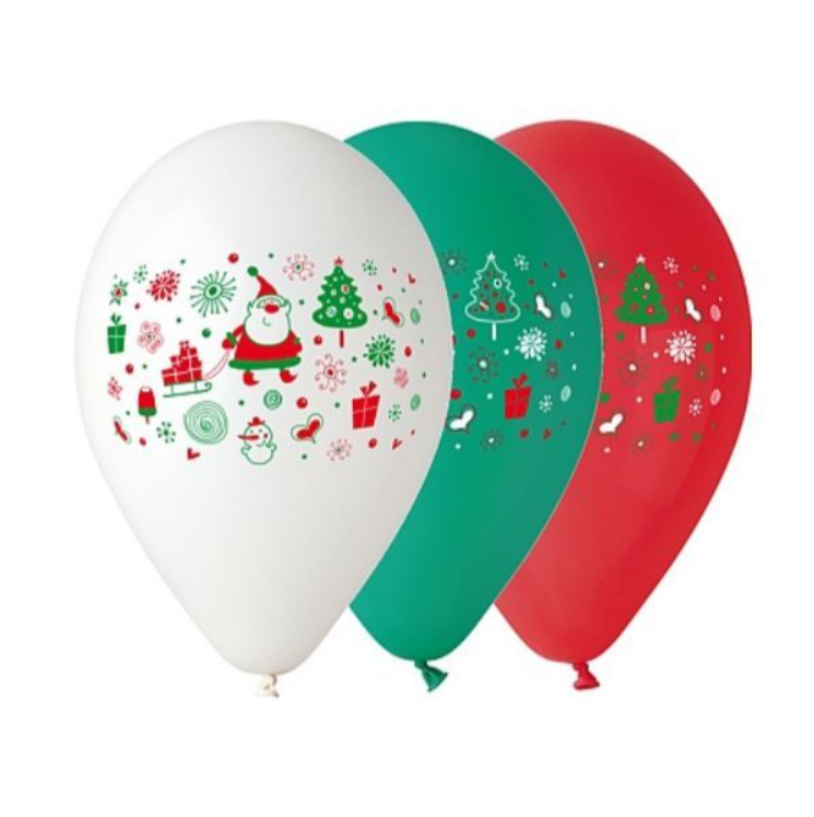 Mikulás mintás ünnepi luficsomag, amely zöld, fehér és piros színű pasztell léggömböket tartalmaz. A lufik felfújt mérete 30 cm
