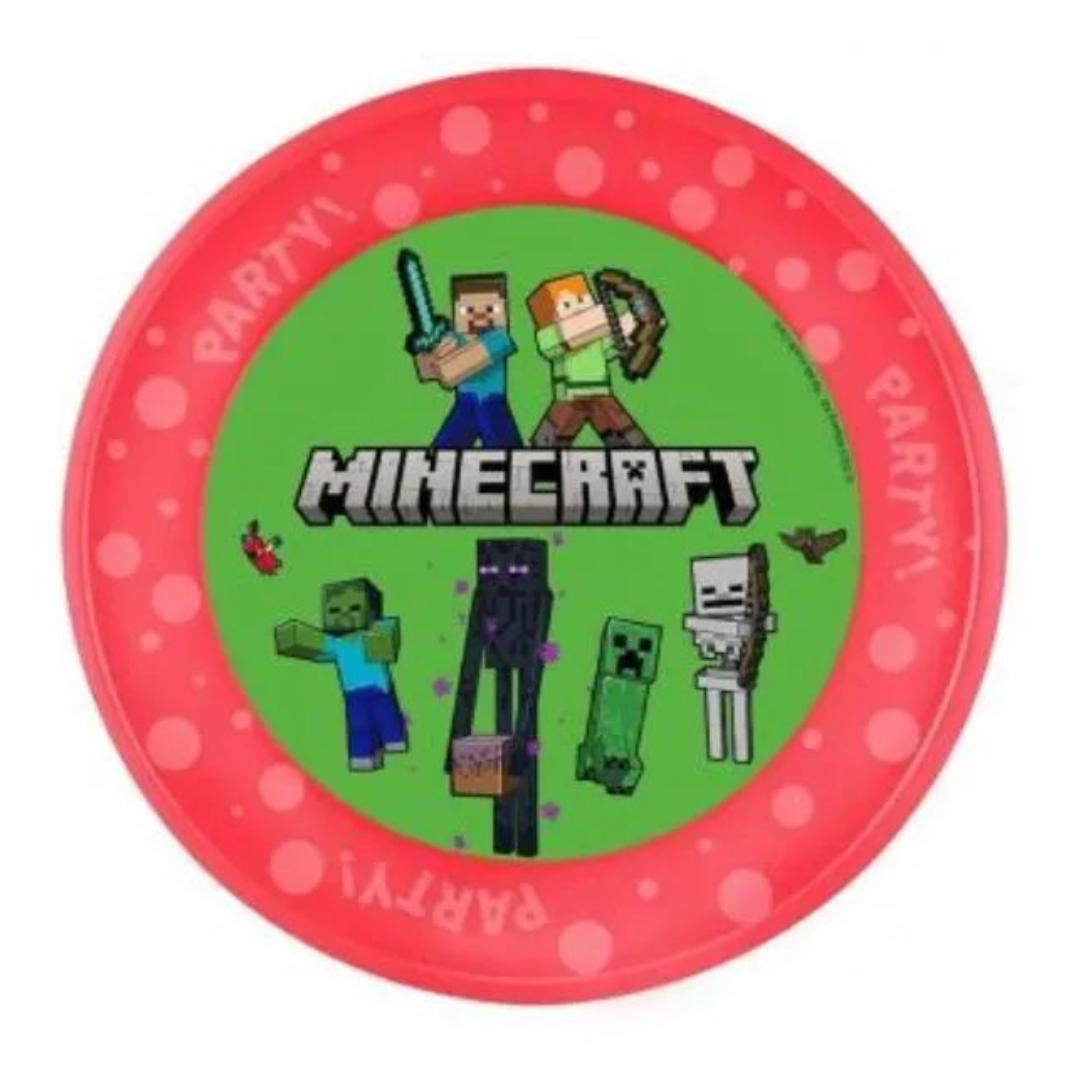 Minecraft mintával díszített műanyag tányér. Tökéletes a népszerű videójáték, a Minecraft rajongóinak. A tányéron Steve, Alex, egy creeper, egy bevégző, egy csontváz és egy zombi található.