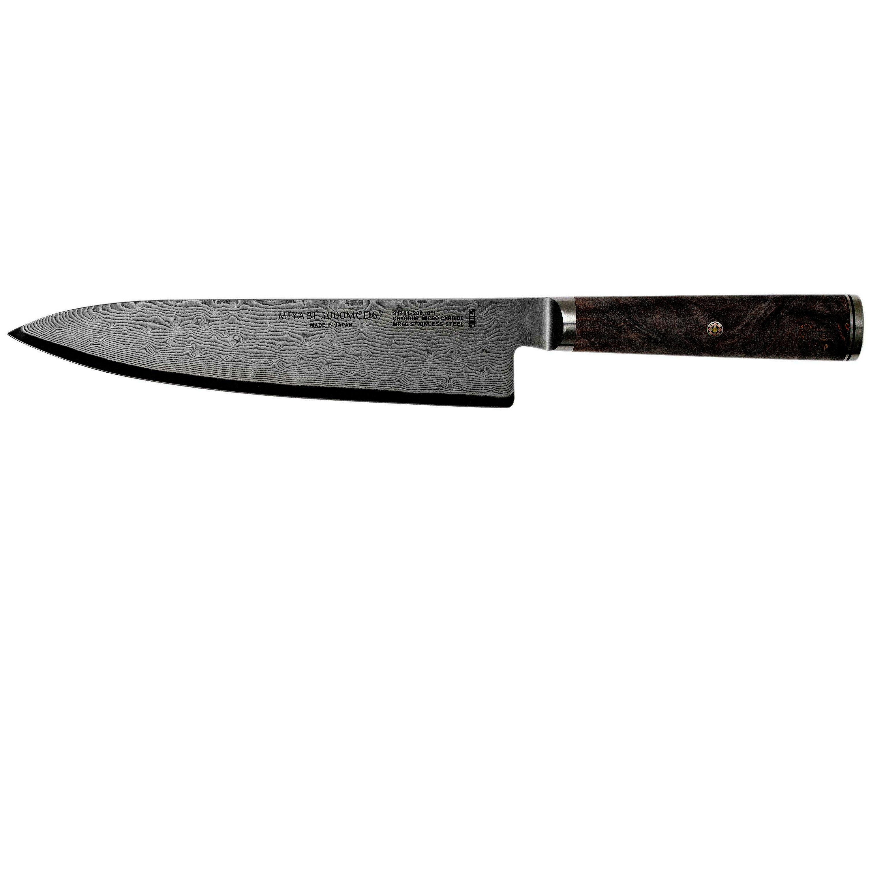 Feketére festett természetes juharfából készült, egyedülálló fogantyúval rendelkezik, amely egy rendkívül szembetűnő műalkotást kölcsönöz. A penge 133 réteg damaszkuszi mintából áll, az arany alapú logó pedig nemesebb benyomást kelt. Ez egy olyan sorozat, amely kiemelkedik a többi MIYABI kés közül.