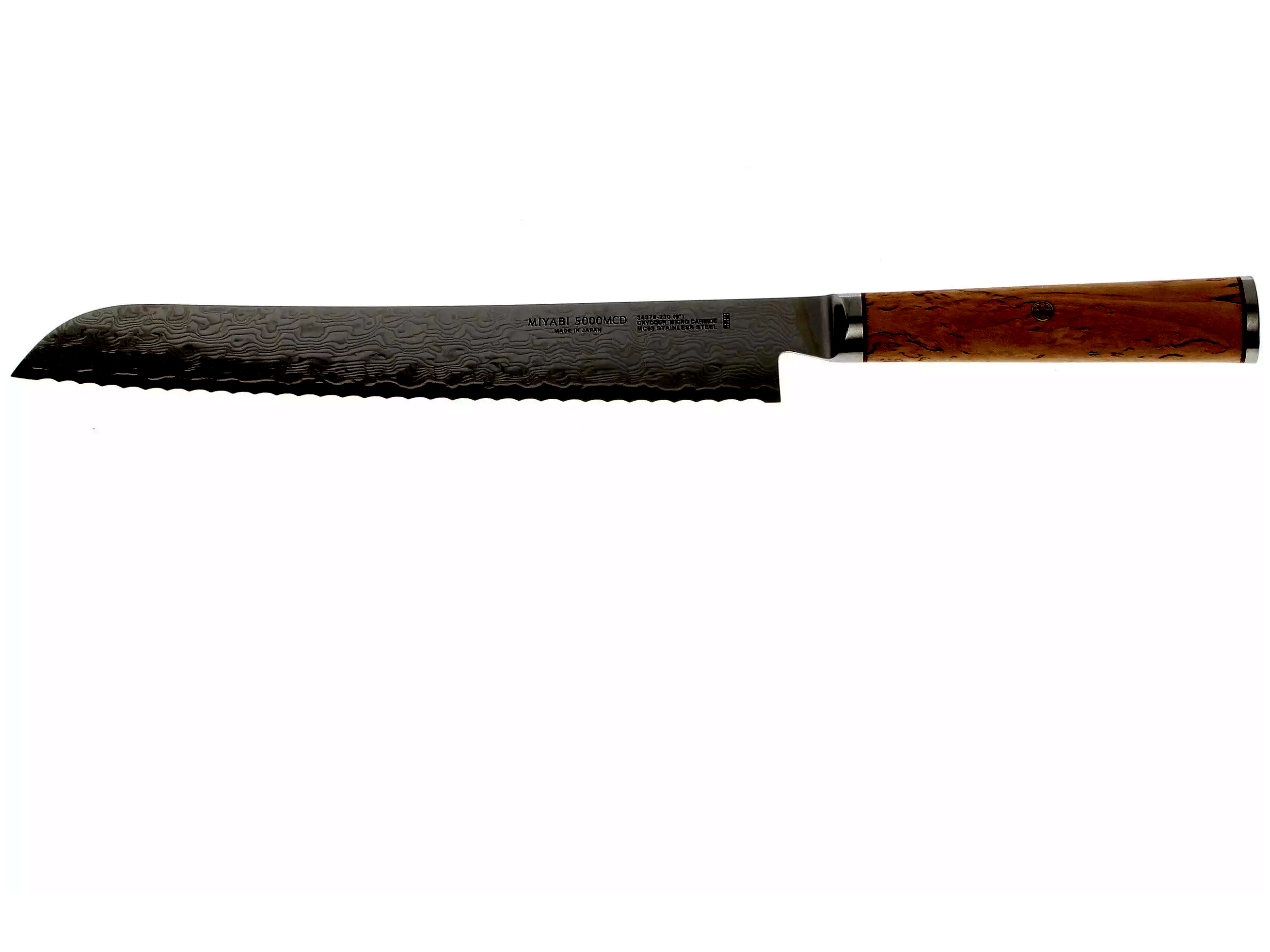 A Miyabi 5000MCD kenyérvágó kés egy igazi mestermű, amely a Zwilling J. A. Henckels seki, japán gyárából származik. Az ergonomikusan formázott, Masur nyírfából készült D-formájú markolat és a damaszkuszi acél penge gyönyörű rajzolata lenyűgöző látványt nyújt.