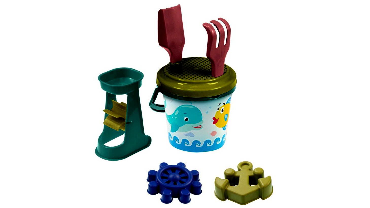 Horgonyt leengedni, a hajó megérkezett a Homokozó-szigetre! A Mochtoys ECO tengerész homokozószettjével a tengerek kis rajongói kedvükre építhetnek és rombolhatnak úgy a kerti homokozóban, mint a homokos vízparton. A készlet elemei strapabíró műanyagból készültek, így a kicsik sokáig élvezhetik majd a velük való játékot. A szettben egy szitával ellátott, aranyos, tengeri állatokat ábrázoló grafikával díszített vödröt, egy horgony és egy kormánykerék formájú homokozóformát, valamint malmot és más homokozóeszközöket találnak a lurkók.