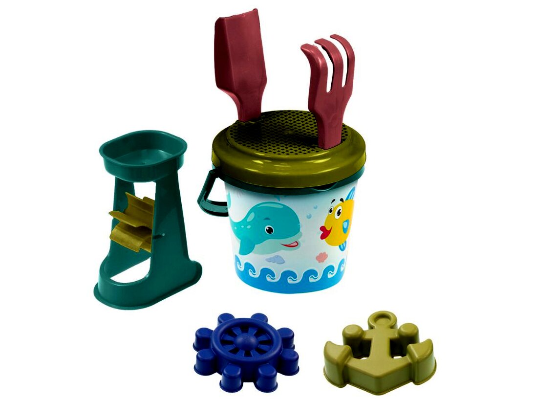 Tartalom: 1 db vödör szitával, 1 db lapát, 1 db gereblye, 2 db homokozóforma, 1 db malom.