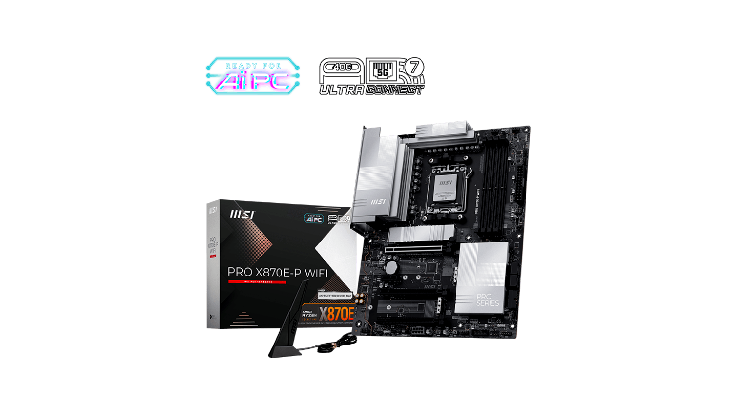 A PRO X870E-P WIFI egy egyszerű és harmonikus ezüst színvilággal illeszkedik mind fehér, mind fekete PC építésekhez. Az MSI számos exkluzív funkciójával, a valódi Wi-Fi 7-tel és az EZ antennával, 5G LAN-nal, PCIe 5.0 M.2-vel és EZ M.2 Shield Frozr II-vel, valamint kiegészítő PCIe táppal, az alaplap kész az AMD Ryzen™ 9000 sorozatú processzorainak támogatására.
