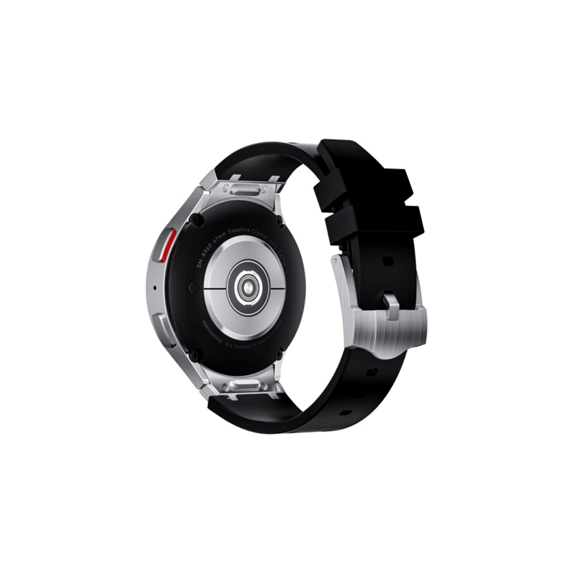 Anyag: Szilikon | Csatlakozó: Fém | Szélesség: 20 mm | Kompatibilitás: Samsung Galaxy Watch 4-5-6-7 | Színe: Fekete/Ezüst