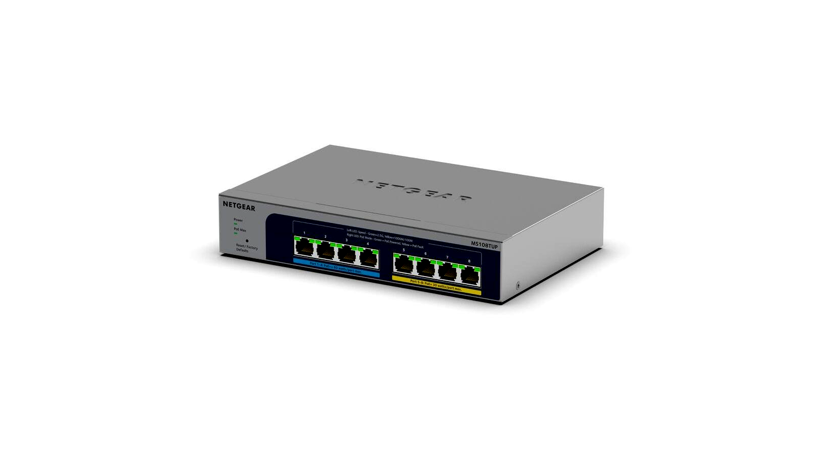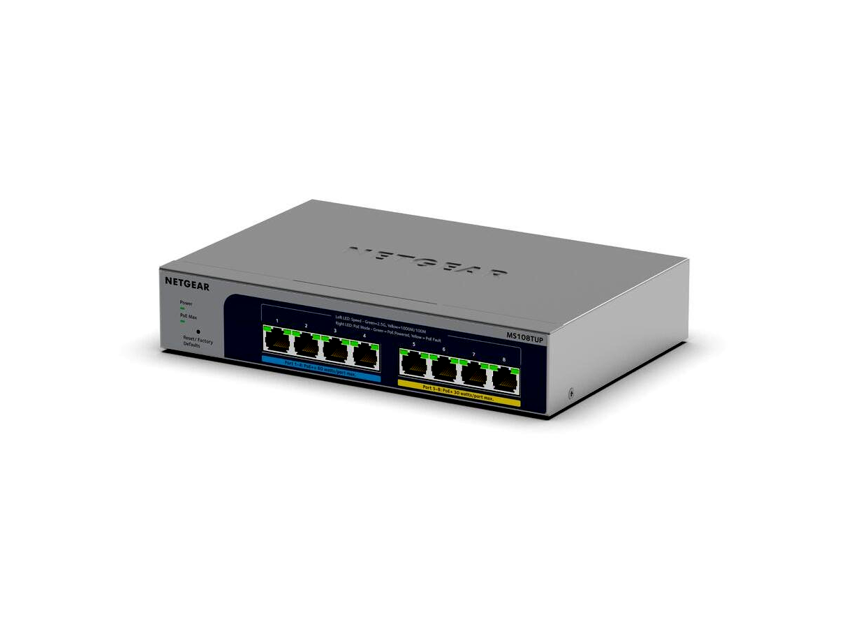A PoE-vel rendelkező NETGEAR Smart Switchek megfelelnek a vállalati hálózatok növekvő igényeinek azáltal, hogy erőteljes Layer 2+/Lite L3 funkciókat, nagyszerű PoE funkcionalitást, valamint megnövelt teljesítményt és használhatóságot biztosítanak, hogy megfeleljenek a vállalkozások növekvő igényeinek. Hálózati sebesség, virtualizáció, felhőalapú szolgáltatások és olyan alkalmazások, mint a VoIP, video streaming és IP-felügyelet, legyen szó vendéglátásról, vendéglátásról, oktatásról vagy kiskereskedelemről. Ezenkívül a WiFi 6 hozzáférési pontok sebességének növekedése nagyobb sebességet igényel a hálózaton. Az MS108TUP támogatja a 2,5 Gigabit sebességű kapcsolatot és a Power OverEthernetet (PoE), amely akár 60 W/port teljesítményt is képes leadni. Az új switch modell olyan eszközöket képes táplálni, mint a VoIP telefonok, IP megfigyelő kamerák, vezeték nélküli hozzáférési pontok és sok más alkalmazás. Ez az új intelligens kapcsoló fejlett PoE-vezérlést tartalmaz a teljesítmény optimalizálása és a vállalati hálózatok hibaelhárítása érdekében. Az új és továbbfejlesztett üzletbarát grafikus felület egyszerű kezelést és konfigurálást tesz lehetővé. Az alkalmazások növekvő használatának és a minden-az-egyben megoldásnak köszönhetően ezeknek az alkalmazásoknak a felügyelete és teljesítménye ideális. Az MS108TUP opcionálisan távolról is vezérelhető a NETGEAR Insight Remote Cloud Management platformon keresztül.