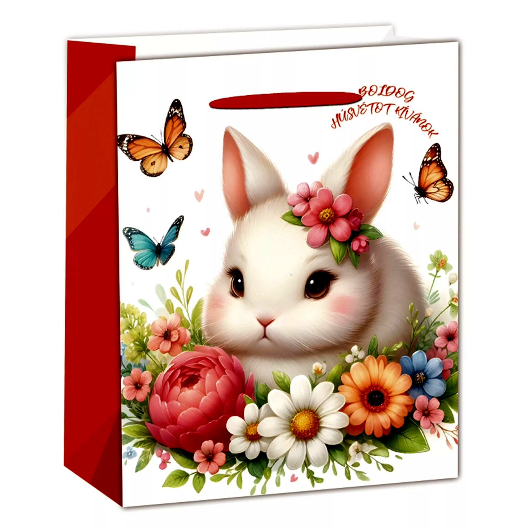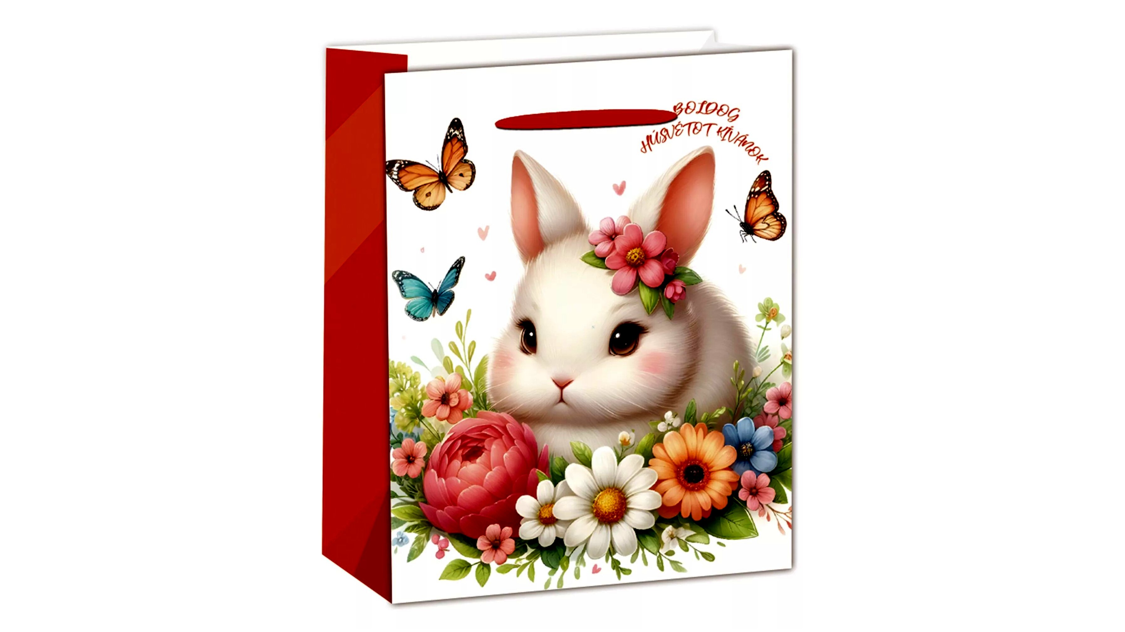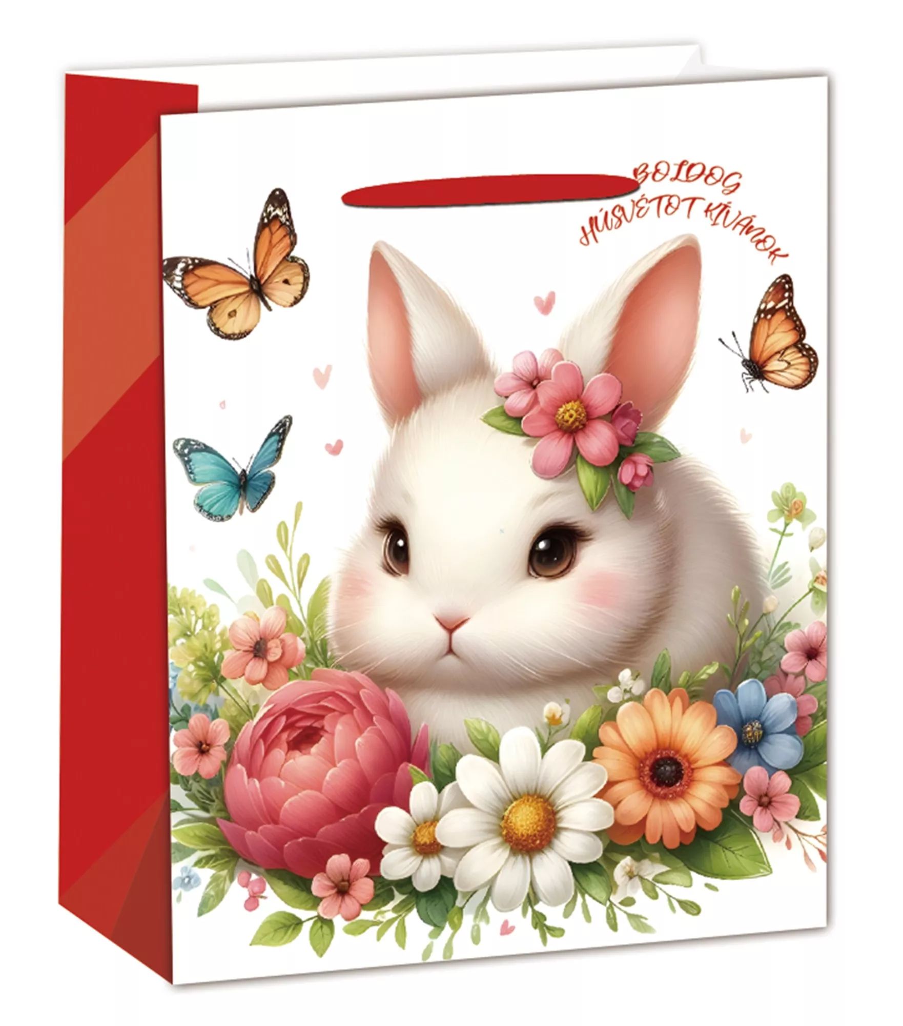 A nyuszi mintás ajándéktasak szalagfüllel tökéletes választás, hogy még különlegesebbé tegye az ünnepi ajándékozást. Vidám és édes minta, ami minden ünnepi alkalmat feldob.