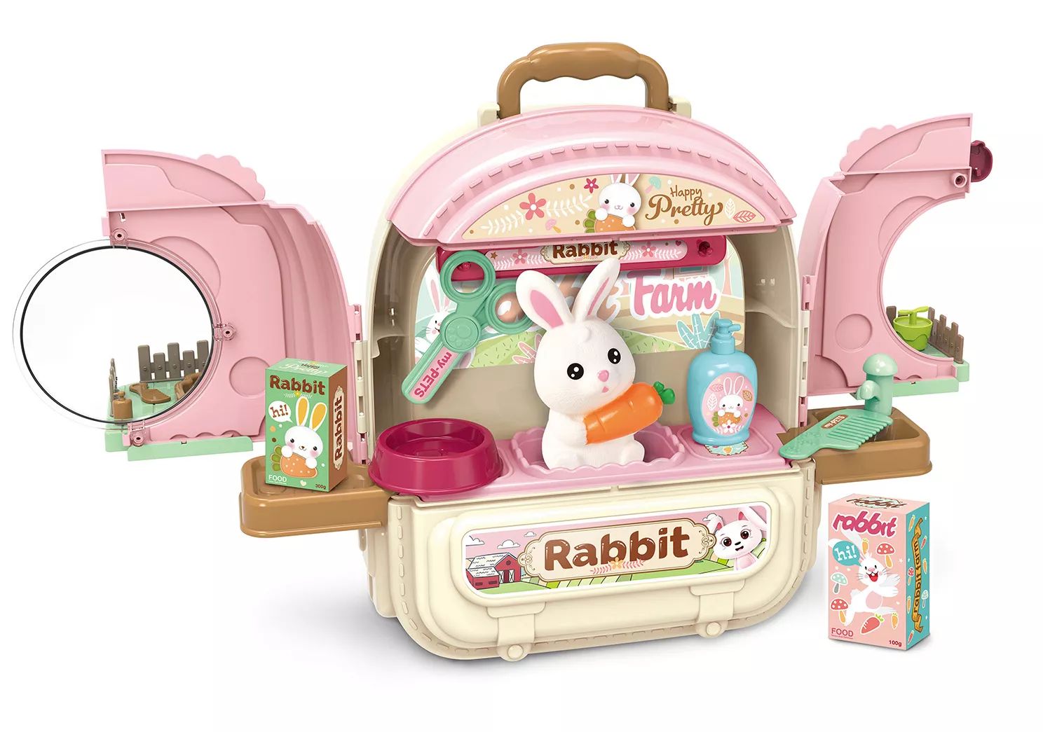 A nyuszikozmetika funkcióval a kicsik „szépségszalonként” használhatják a készletet, eljátszva a fésülést, ápolást, míg a kisállatfarm rész segít megérteni, milyen feladatokkal jár a mindennapi állattartás. A hordozható doboz kialakításnak köszönhetően a játéktér pillanatok alatt átrendezhető, így mindig új történetek és játékhelyzetek hozhatók létre.