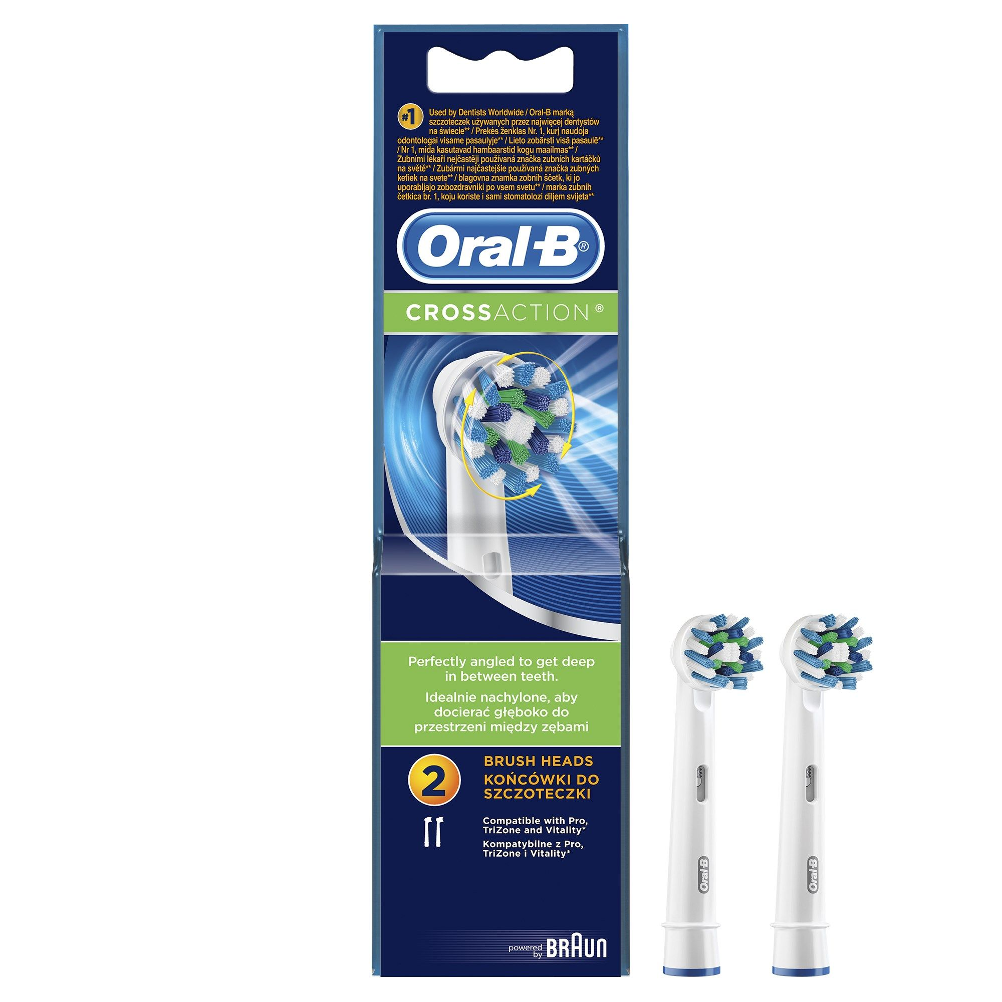 A CrossAction az Oral-B egyik prémium pótfejeként tökéletesen beállított sörtékkel rendelkezik, amelyek a manuális fogkeféknél akár 100%-kal több lepedéket is fellazítanak és eltávolítanak. Az egyedi kialakítású Oral-B CrossAction fogkefefej gondosan megtervezett sörtékkel rendelkezik, hogy a lehető legjobban körülölelje a fogakat. A sörték mélyen behatolnak a fogak közé, és a manuális fogkeféknél jóval több lepedéket távolítanak el, elősegítve a teljes szájüreg fokozottabb tisztaságát. Minden oszcilláló és forgó fogkefével használható.