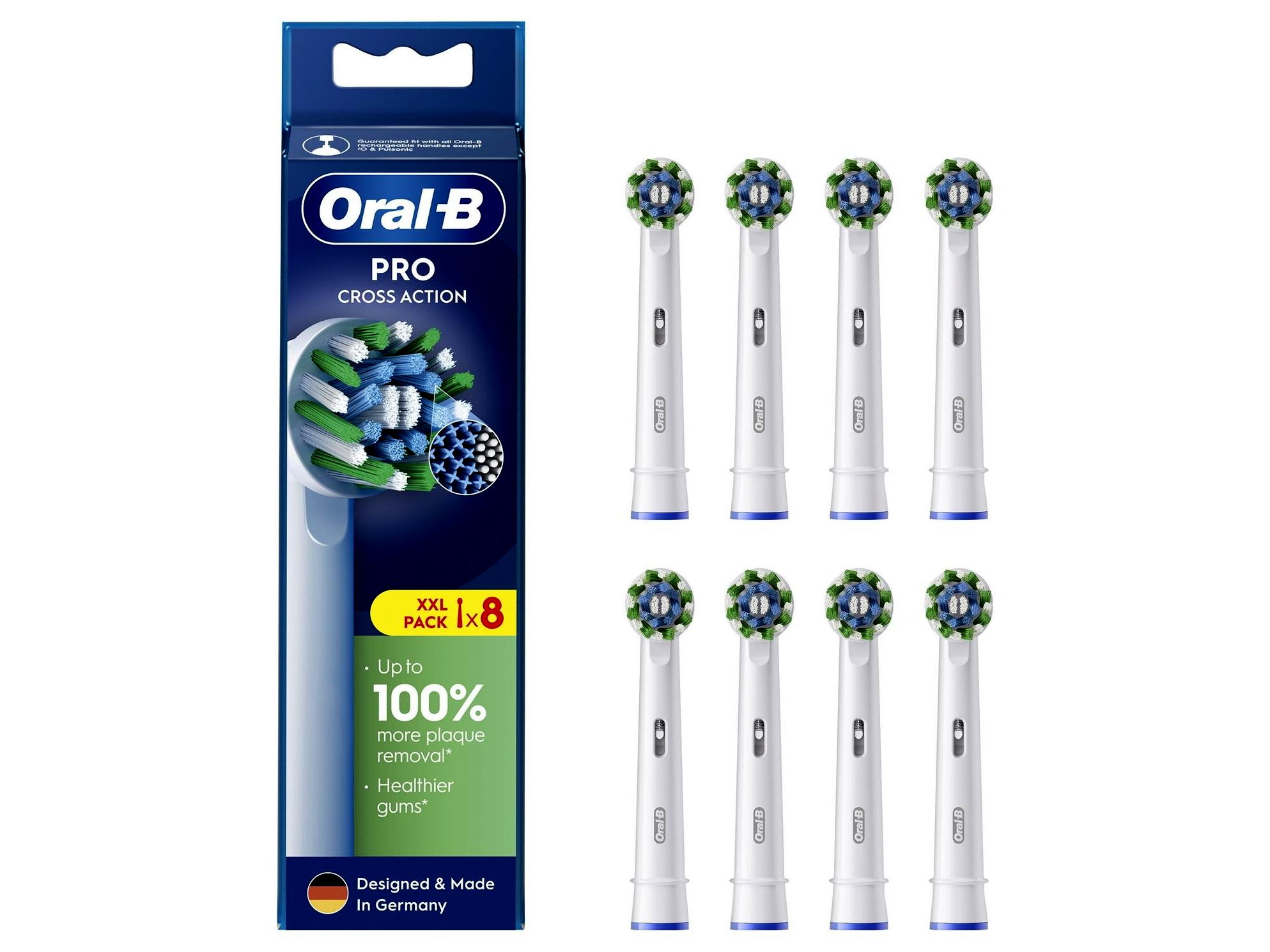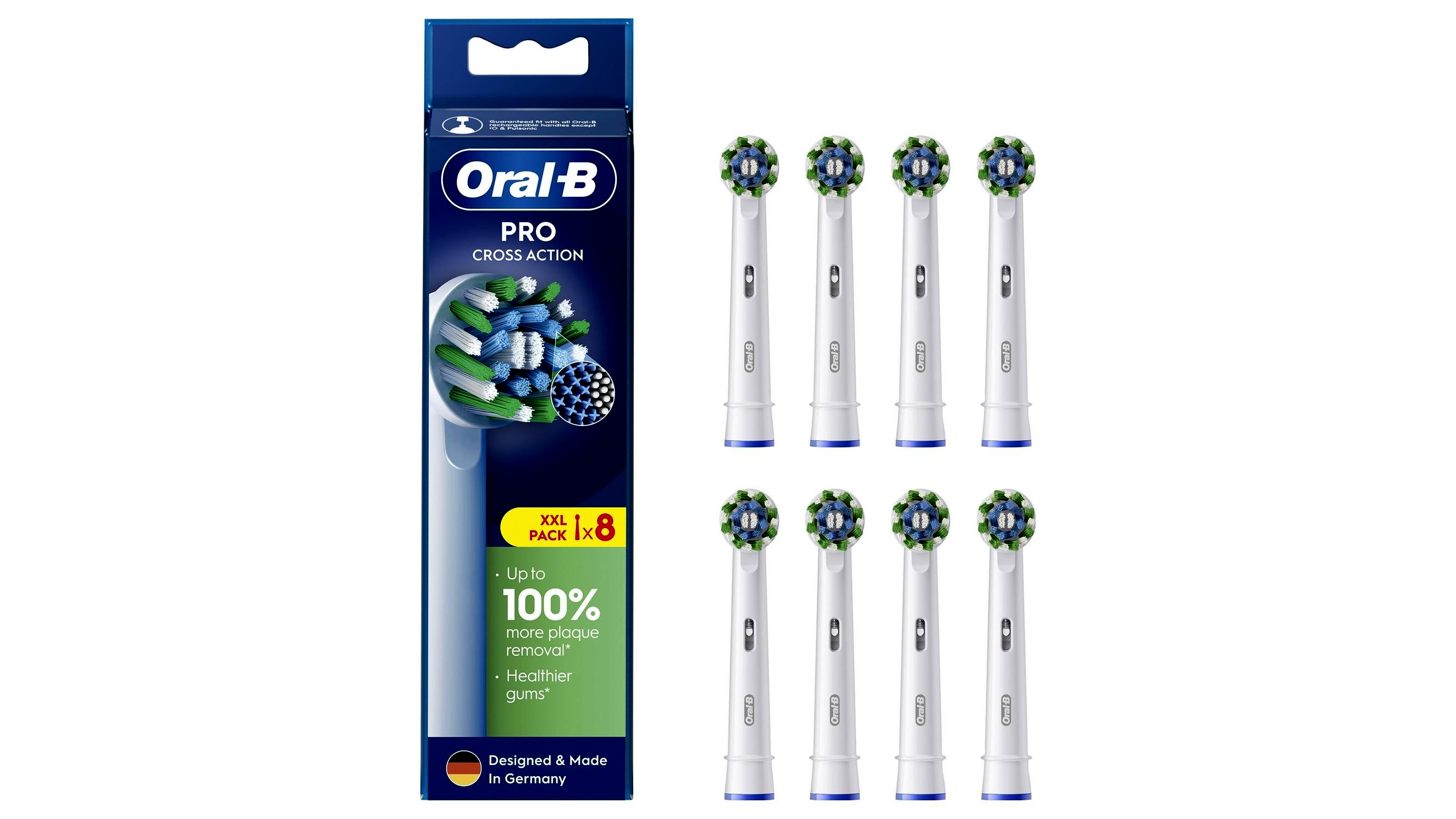 Az Oral-B Pro CrossAction fogkefefej több mint 2200 tökéletesen hajlított sörtékkel rendelkezik, amelyek akár 100%-kal több lepedéket távolítanak el, mint a kézi fogkefe – a tisztább fogak és az egészségesebb fogíny érdekében. Az eredeti Oral-B kefefejek új X-alakú sörtékkel rendelkeznek, amelyek megtisztítják azokat a területeket, amelyeket a hagyományos sörték nem érnek el. A zöld jelzősörték idővel sárgává válnak az egyéni használattól függően, így jelzik a kefefej cseréjének optimális idejét – a 100%-os tisztítási hatékonyság érdekében. Garantáltan illeszkedik minden Oral-B újratölthető fogkeféhez, kivéve a Pulsonic és az iO.