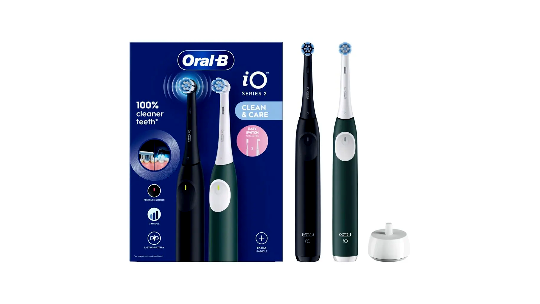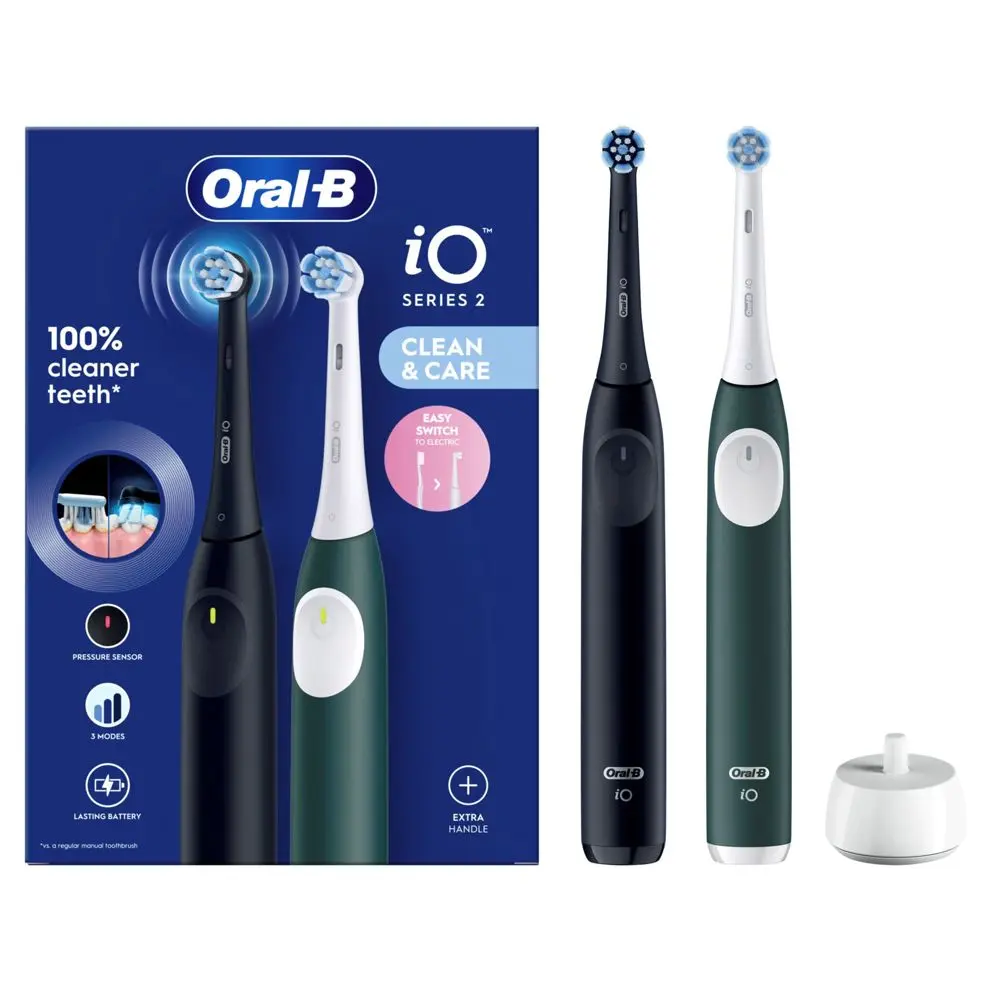 Az Oral-B iO Series 2 elektromos fogkefe a szájhigiénia új szintjét hozza el számunkra. Ez a modell két különböző színben érkezik: elegáns éjfekete (Night Black) és természetes erdei zöld (Forest Green). A csomag két fogkefe nyéllel érkezik, hogy Ön és partnere egyaránt élvezhesse a csúcstechnológia minden előnyét.