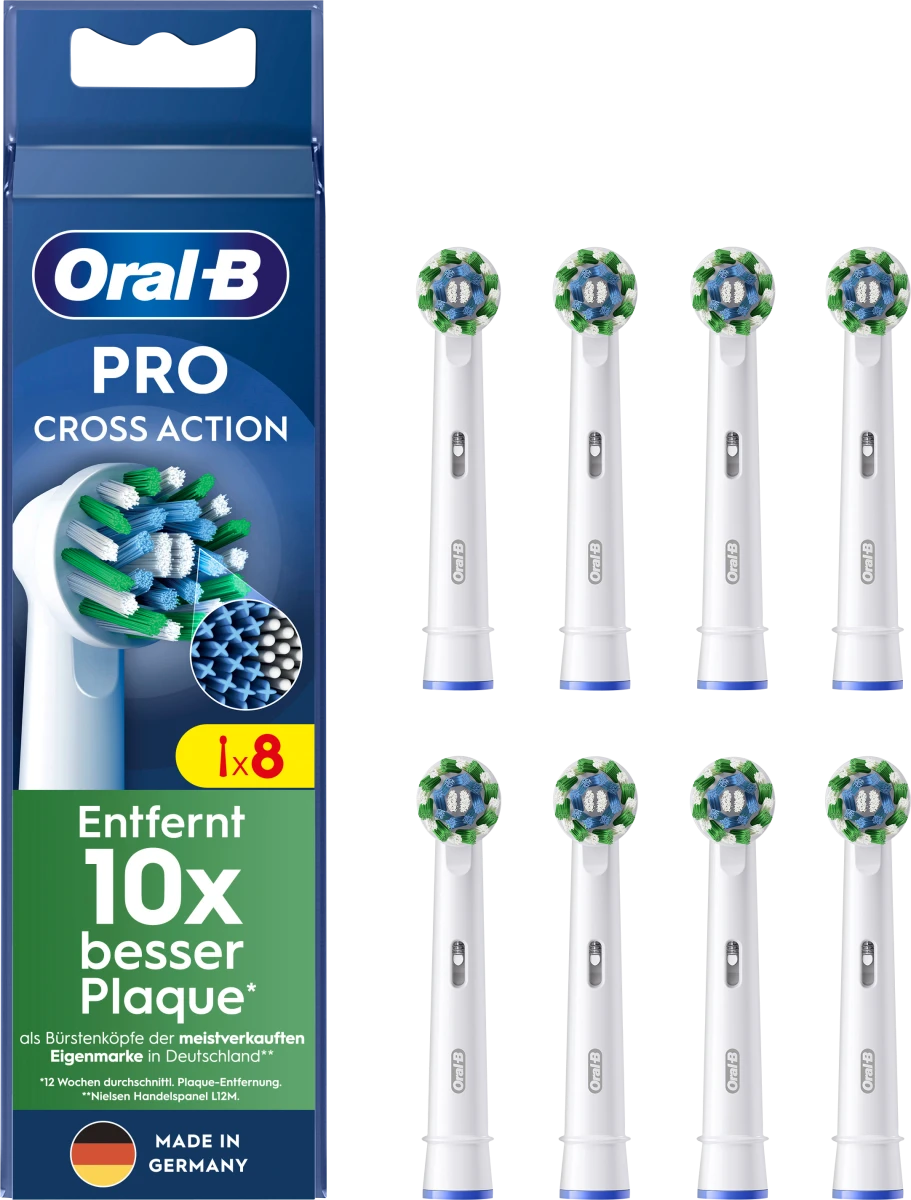 Az Oral-B Pro Cross Action kefefejek X-alakú sörtékkel rendelkeznek, amelyek eltávolítják a lepedéket azokról a területekről, amelyeket más sörték nem tudnak elérni. Ezeknek a keféknek a kerek feje körülveszi a fogat, és így eléri a fogak közötti réseket. A Cross Action a 16°-os szögben elhelyezett sörtéket jelenti, ami tovább növeli a tisztítási teljesítményt. Ezek a kefék indikátorsörtékkel működnek, amelyek színe megváltozik, jelezve a megfelelő időpontot az ecsetcseréhez. A csomag 8 db kefefejet tartalmaz.