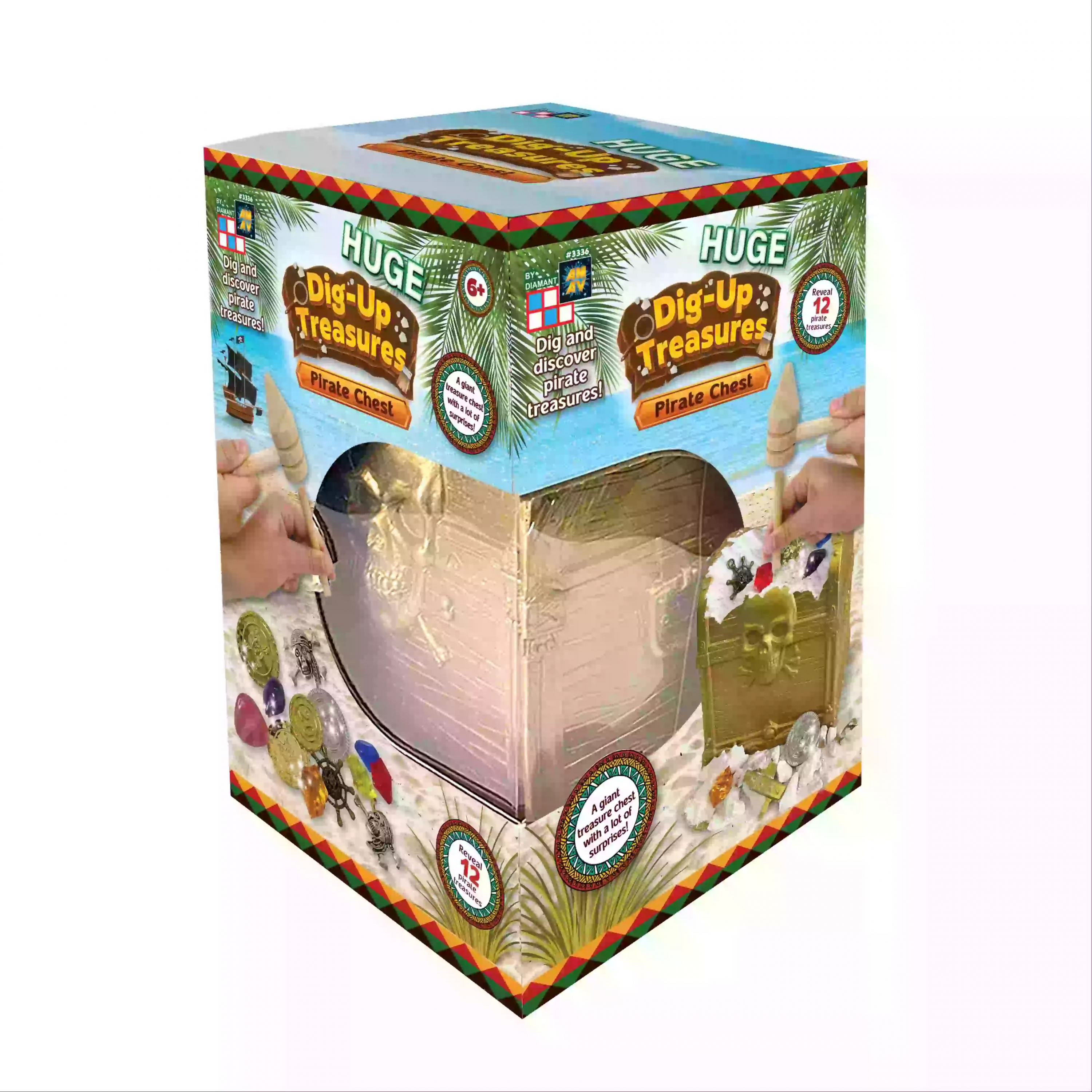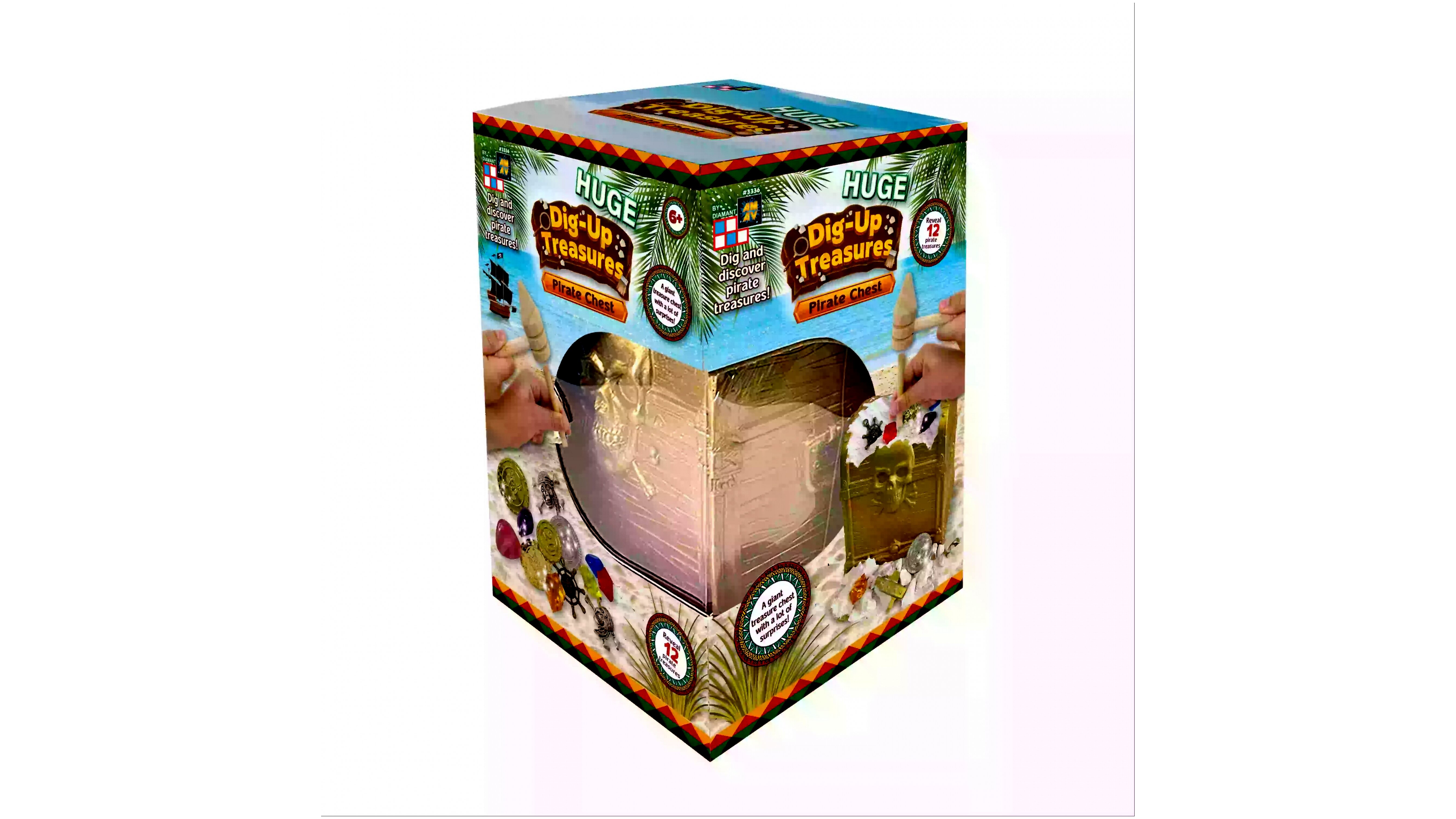- Részletes, kalóz témájú design: valósághű aranyszínű láda és kincsek