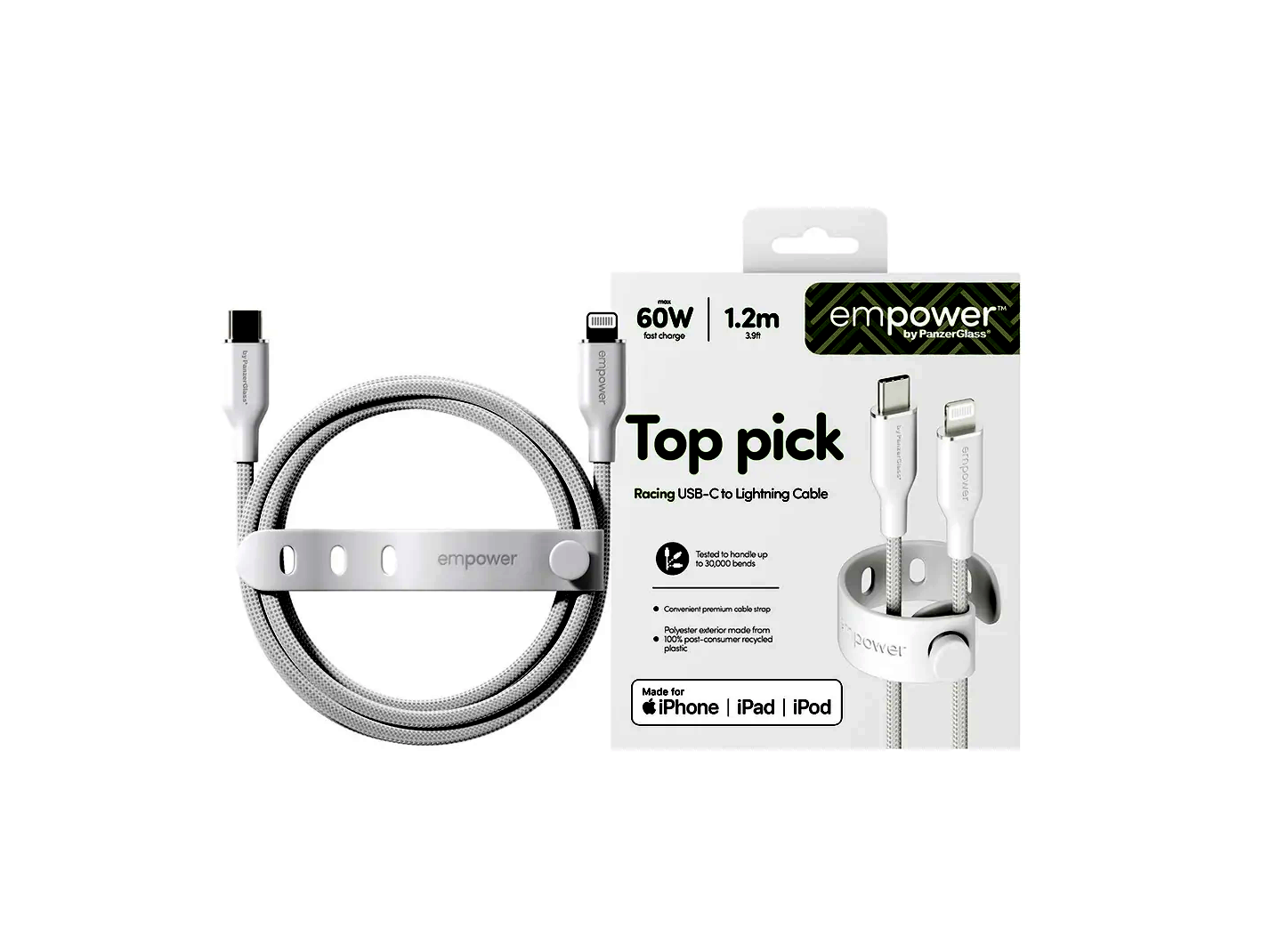Az empower by PanzerGlass® versenykábel-sorozatában a megbízhatóság találkozik a sebességgel. Ez a robusztus, fonott kábel akár 30 000 hajlítást is kibír – maximális tartósságra és hosszú élettartamra tervezve.