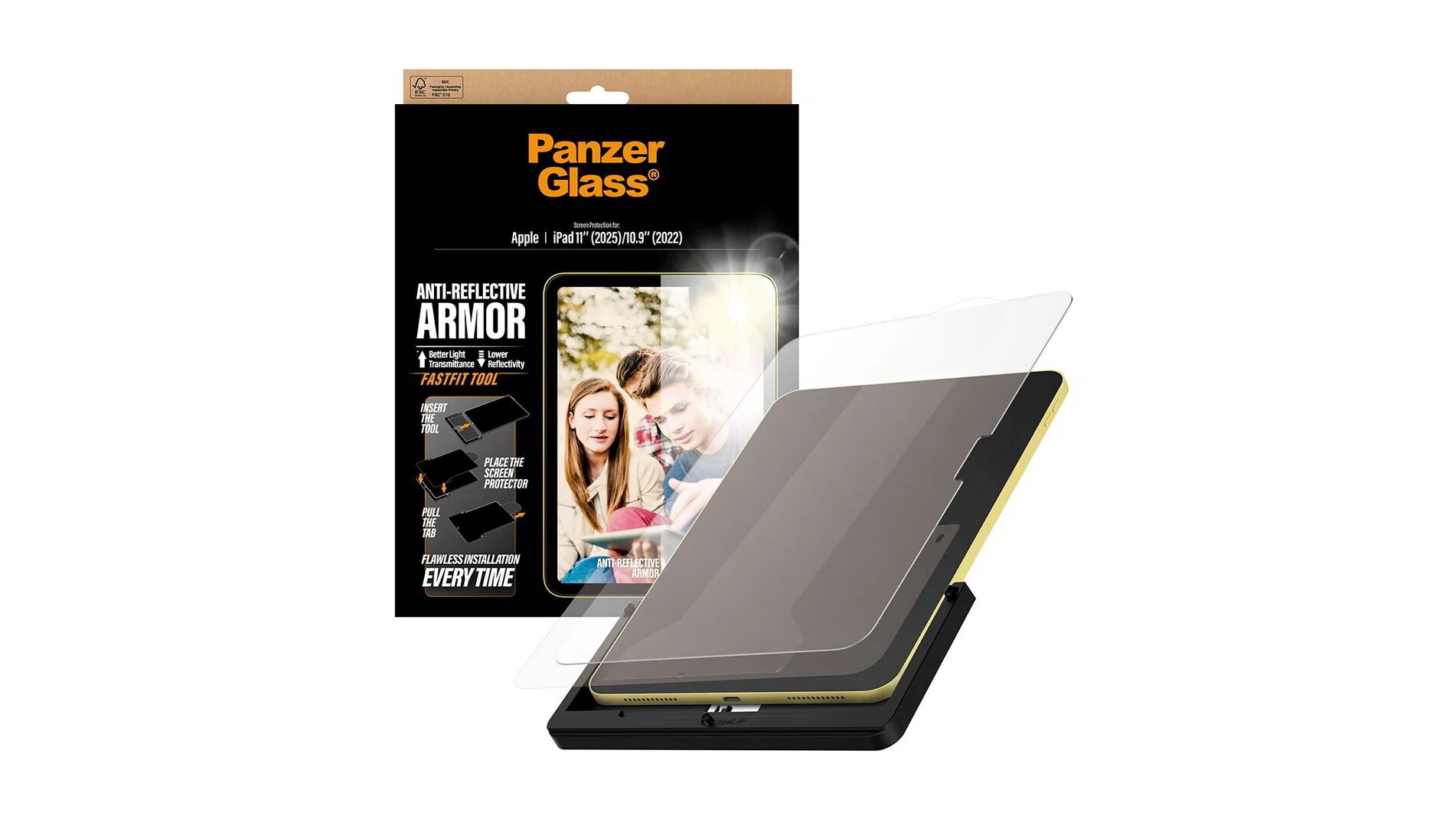 A PanzerGlass FastFit segédeszköz megkönnyíti az üveg tökéletes pozicionálását. Az iPadet elég kijelzővel felfelé a sablonba helyezni, majd a fület meghúzni – így az üveg automatikusan felkerül a megfelelő helyre. A kialakítás segít minimalizálni a légbuborékok és a por bekerülésének esélyét, így tiszta, buborékmentes felületet kapsz.
