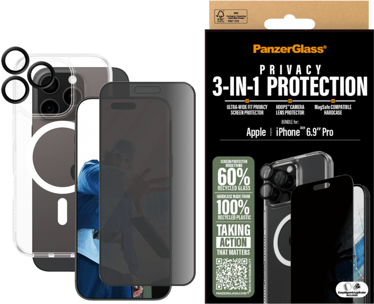 PanzerGlass 3in1 Privacy Protection Bundle iPhone 16 Pro Max csomag a tökéletes választás, ha teljes körű védelmet keresel készüléked számára. A PanzerGlass már több éve ismert a csúcsminőségű üvegfóliáiról és telefontokjairól, amelyek maximális biztonságot nyújtanak modern készülékeidnek.