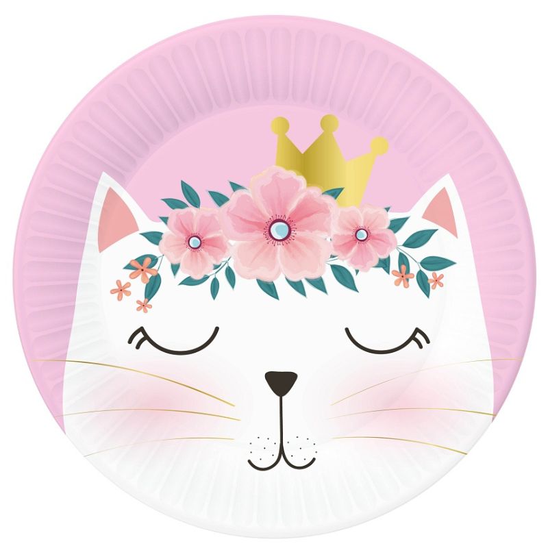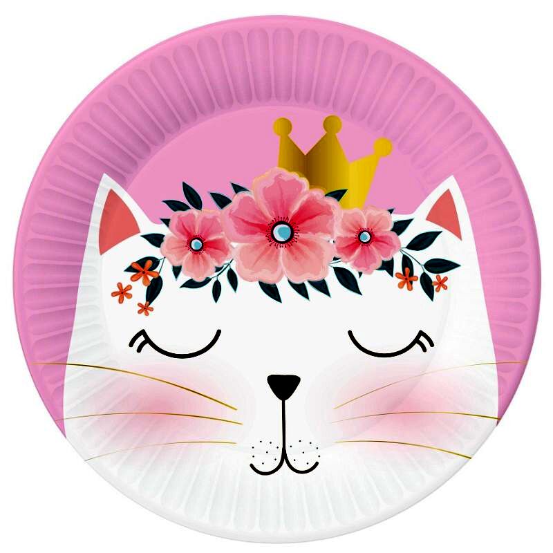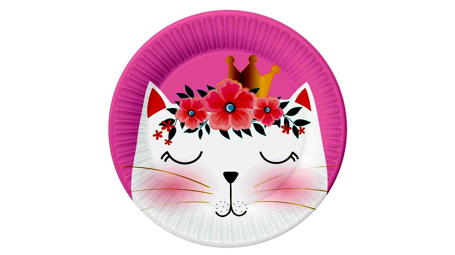 Imádnivaló, igazán stílusos, virágos fejdíszt és koronát viselő, csukott szemű cicát ábrázoló papírtányér szett születésnapi, névnapi bulikra vagy tematikus mulatságokra - hogy ne kelljen a nagy napon annyit mosogatni.