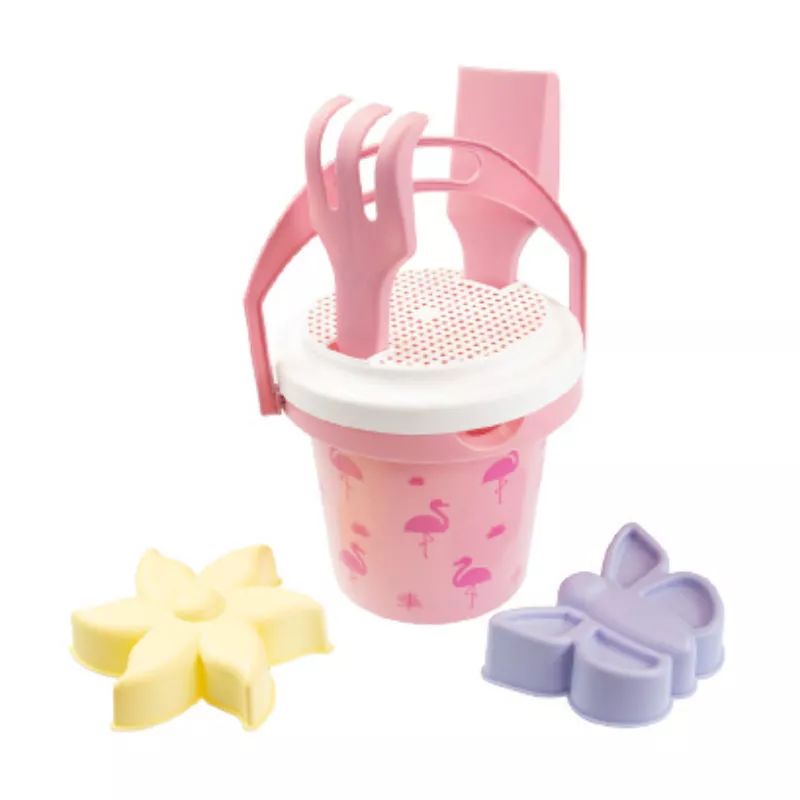 Pasztell rózsaszín homokozó szett, amely egyaránt használható a kertben, a strandon vagy a tengerparton. Vastag, strapabíró műanyagból készült.