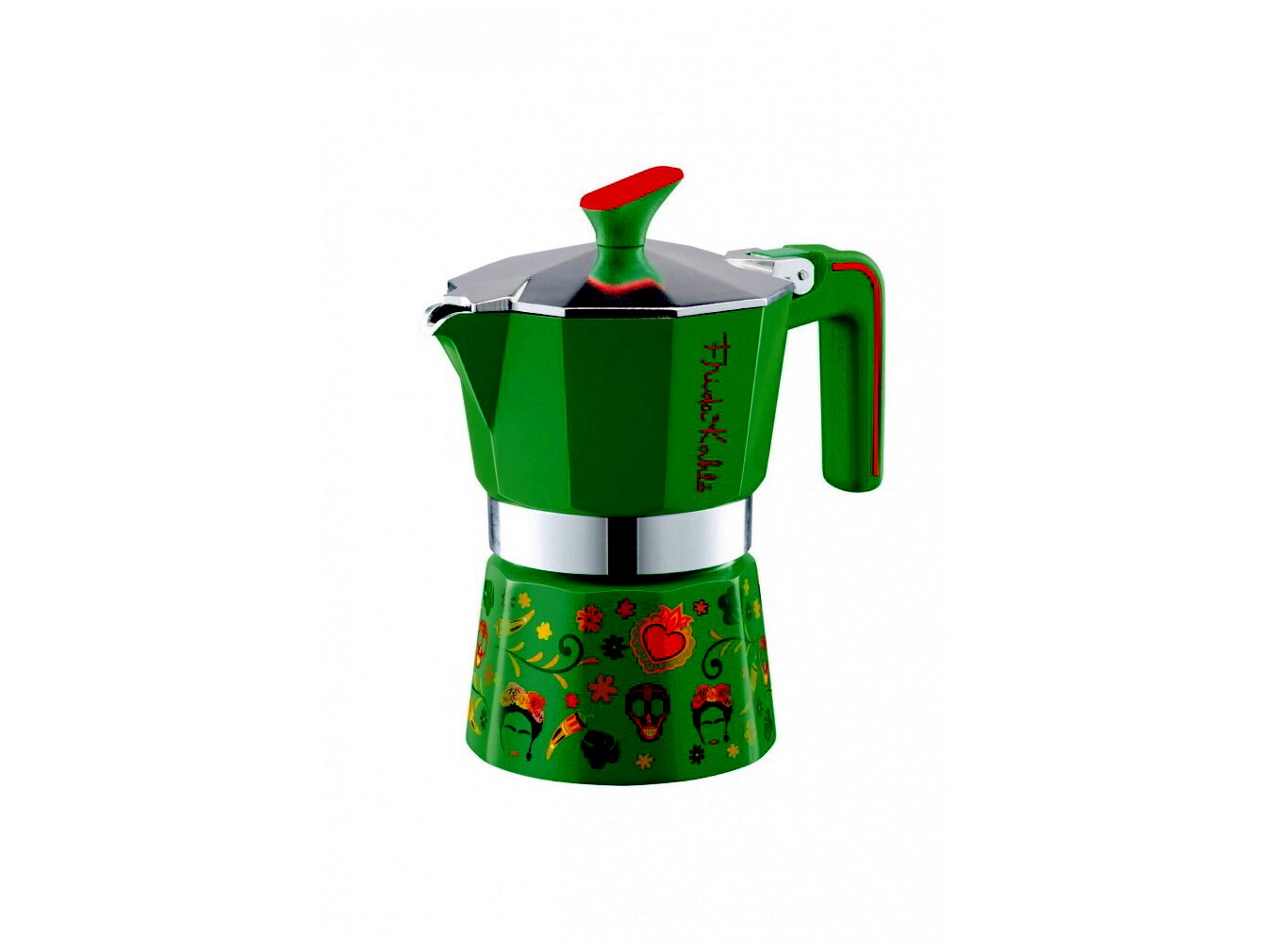 A kávéfőző zöld színű és a híres mexikói festőnő, Frida Kahlo ihlette egyedi mintázattal rendelkezik. A Pedrini minőségi olasz gyártó, amely az elegancia és a funkcionalitás kombinációjáról híres.