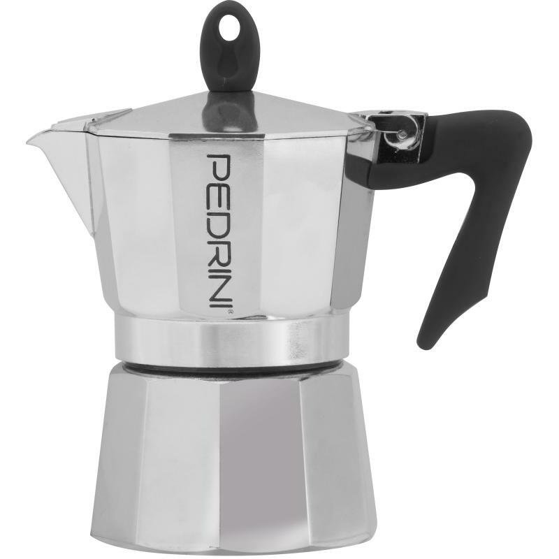 Pedrini márkájú kávéfőző polírozott alumínium felülettel, mellyel egyszerre 3 csésze kávét készíthet. Ez az elegáns ezüst-fekete készülék nemcsak praktikus, de esztétikus is, így bármely konyha dísze lehet.