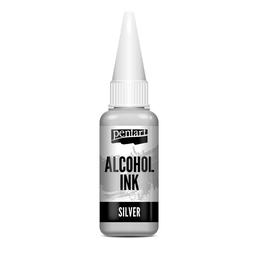 A megfelelő felületválasztással, a tinta hígító tudatos használatával és a különböző Pentart alkoholos tinta színek kombinálásával bámulatos struktúrák, átmenetek és csillogó részletek hozhatók létre – így ez a metál ezüst tinta ideális eszköz minden olyan alkotónak, aki szeret kísérletezni a fénnyel, a textúrákkal és az egyedi vizuális hatásokkal.