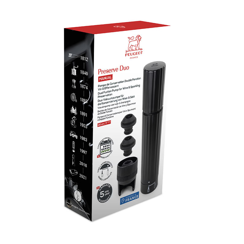 A Peugeot Preserve Duo Manuális Vákuum pumpa szett tökéletes megoldást kínál, ha hosszabb ideig szeretné megőrizni borai és habzóborai frissességét és aromáját. Ez az elegáns és praktikus eszköz minden borrajongó számára nélkülözhetetlen kiegészítő.