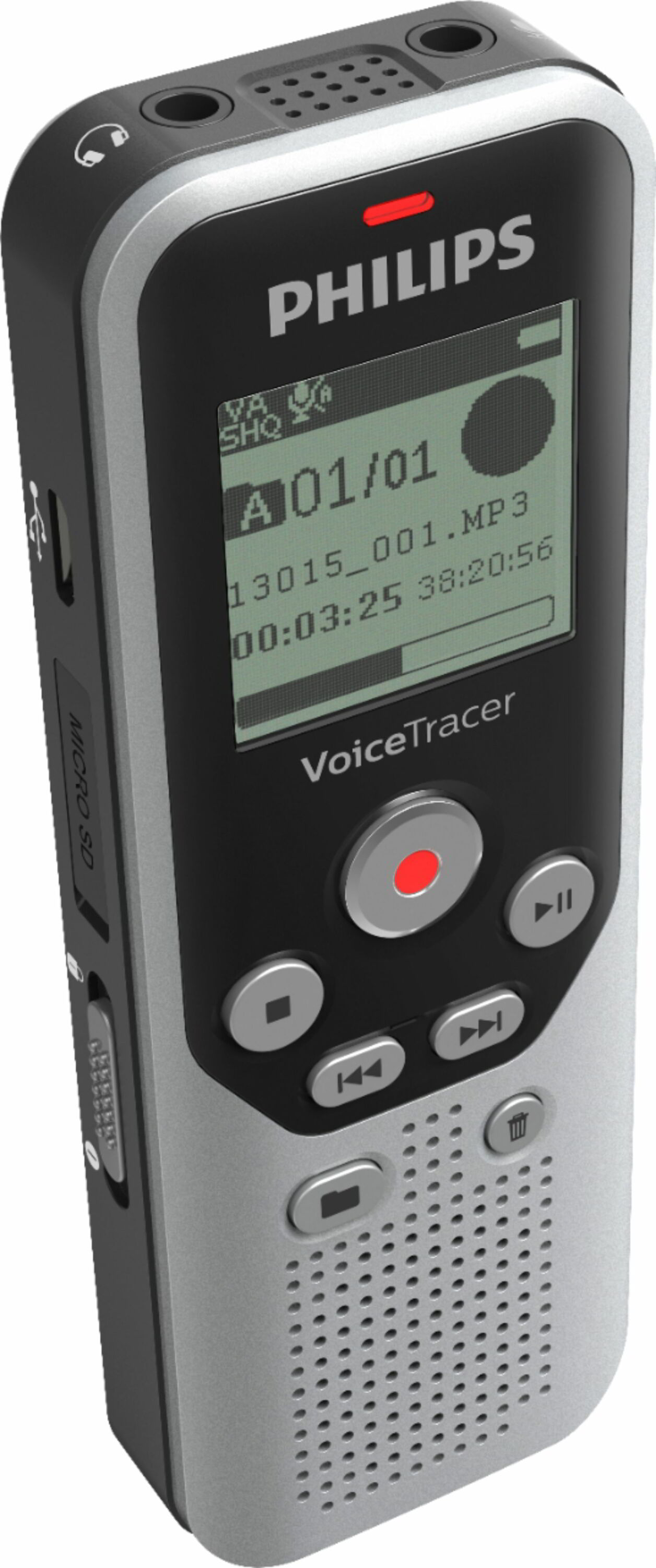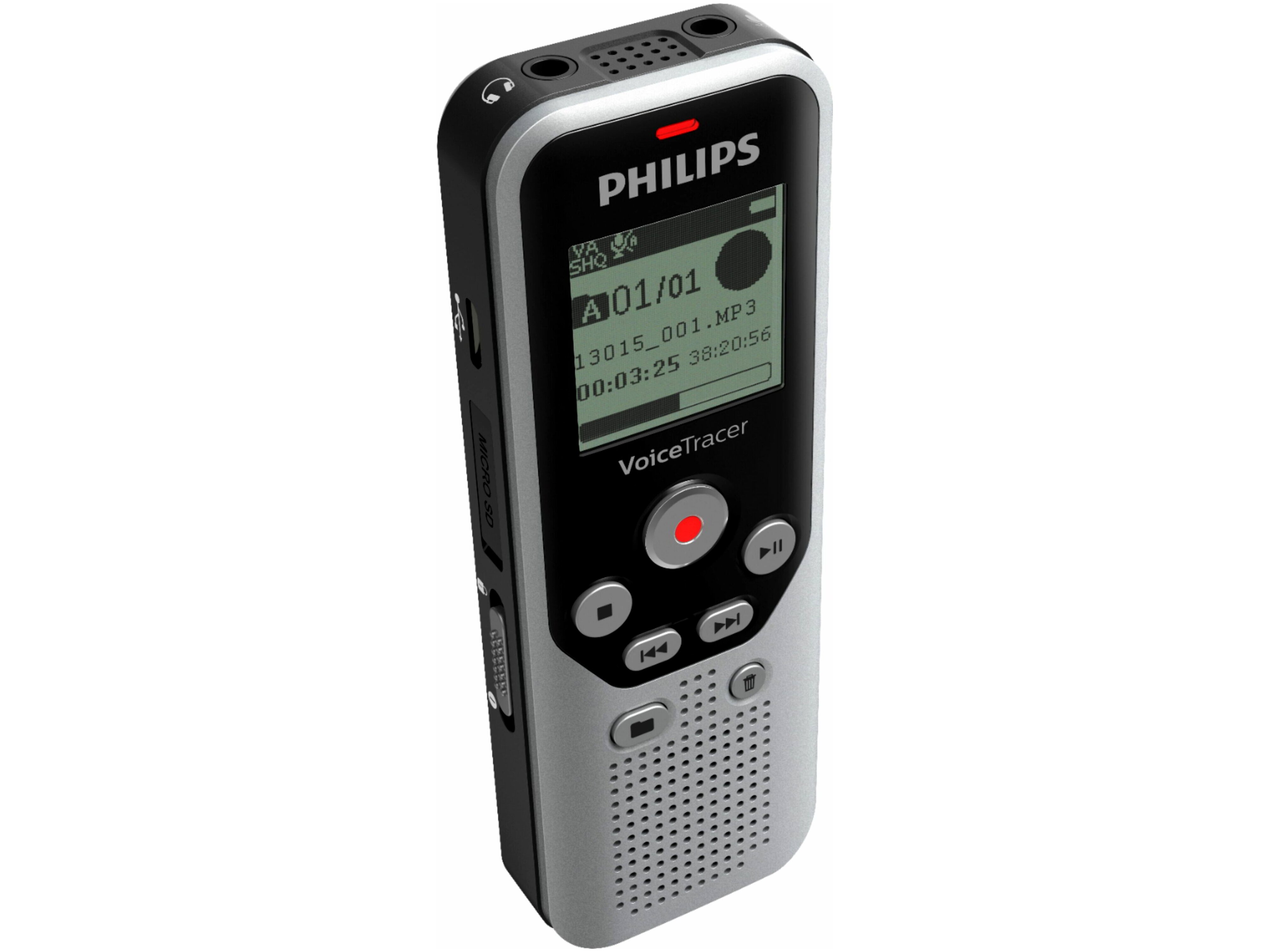 A Philips DVT1250 ezüst és fekete színkombinációjával, kompakt méretével (37 x 108 x 19 mm) és mindössze 67 grammos súlyával ideális választás bárki számára, aki útközben is szeretné rögzíteni a fontos információkat. Az eszköz két AAA (Micro) elemmel működik, ami biztosítja a hosszú üzemidőt, így akár 583 órányi felvételt is készíthetünk.