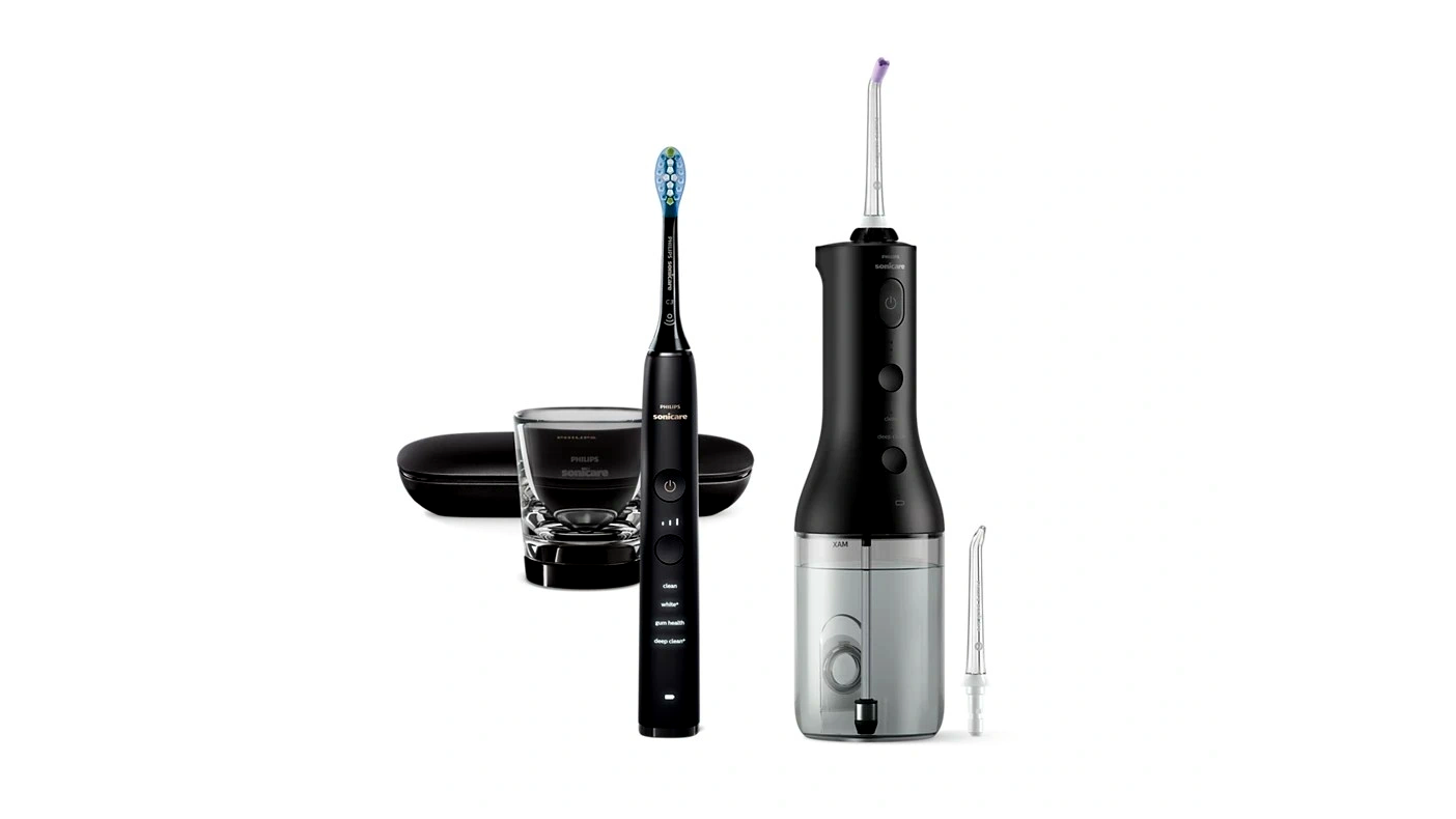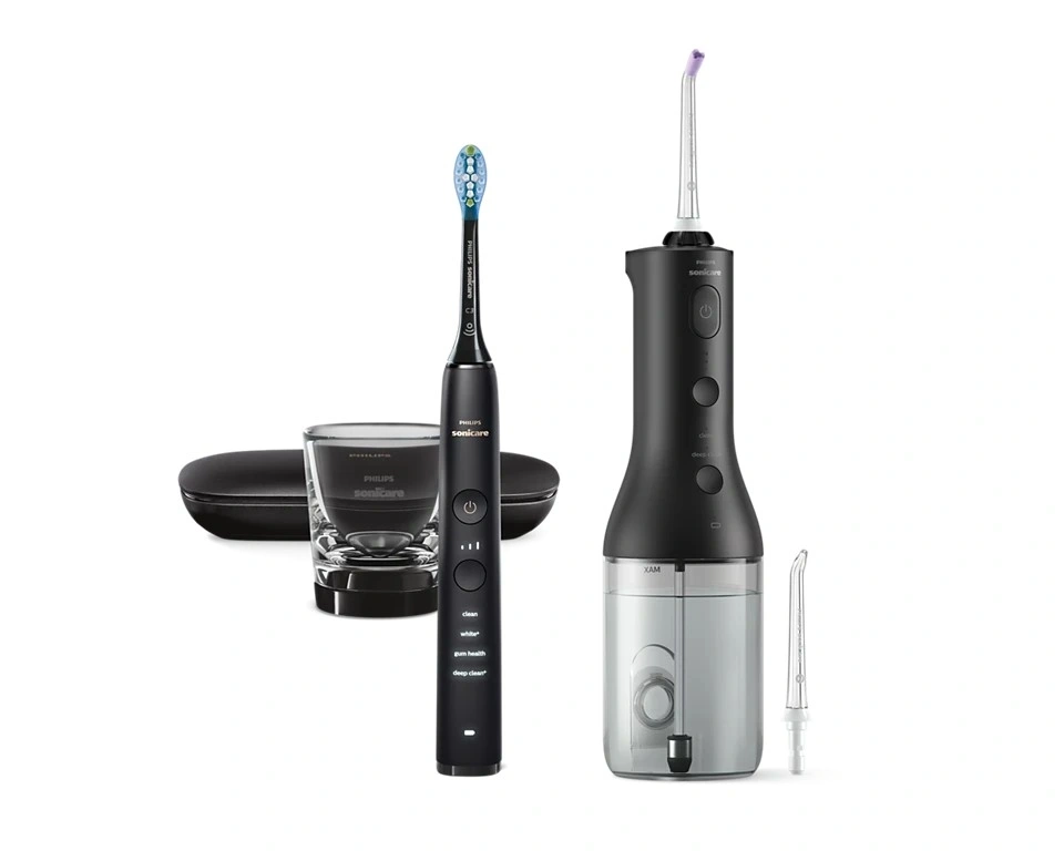 • Teljes szájápoló csomag – szónikus elektromos fogkefe + fejlett fogköztisztító egy dobozban