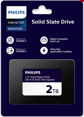 A Philips S130 SSD egyszerűen beszerelhető a szabványos SATA-csatlakozóval rendelkező laptopokba és asztali számítógépekbe. Ezáltal kompromisszum nélküli teljesítményt biztosít minden környezetben, legyen az otthoni vagy irodai használat.