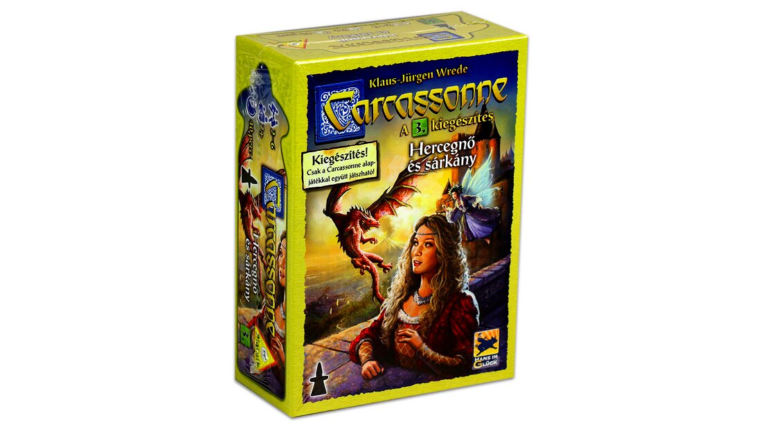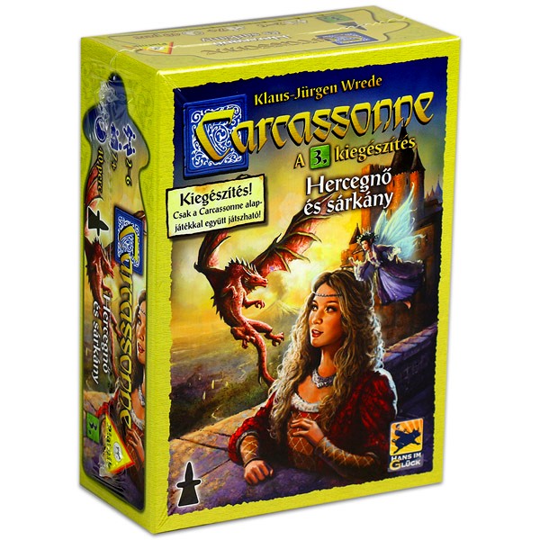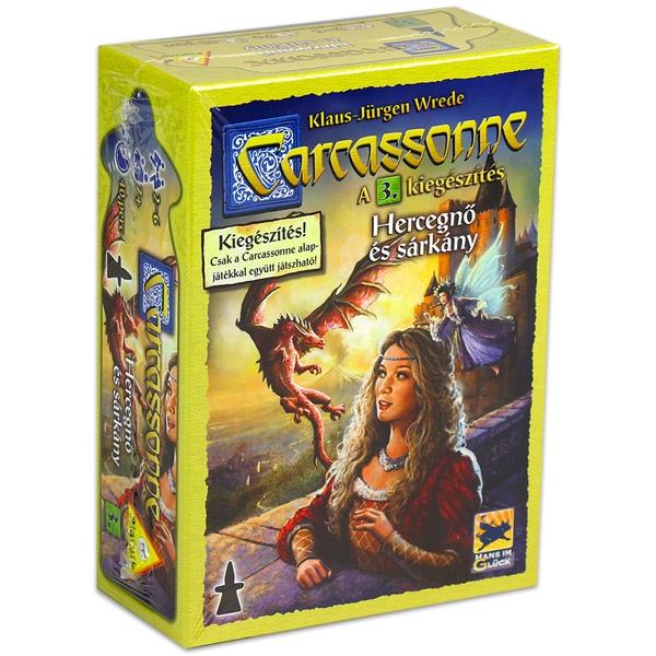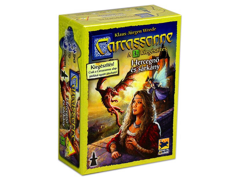 Carcassonne társasjáték 3. számú kiegészítése, Hercegnő és sárkány. A sárkányok perzselő tűzzel érkeznek a játékba, hogy elűzzék követőidet, de a tündérektől védelmet kaphatsz ellenük és pontot a játékban! A Hercegnő lovagokat tud csábítani a városba! A kiegészítés csak a Carcassonne alaptársasjátékkal együtt játszható! A csomagolás mérete: 19 x 17 x 7 cm.