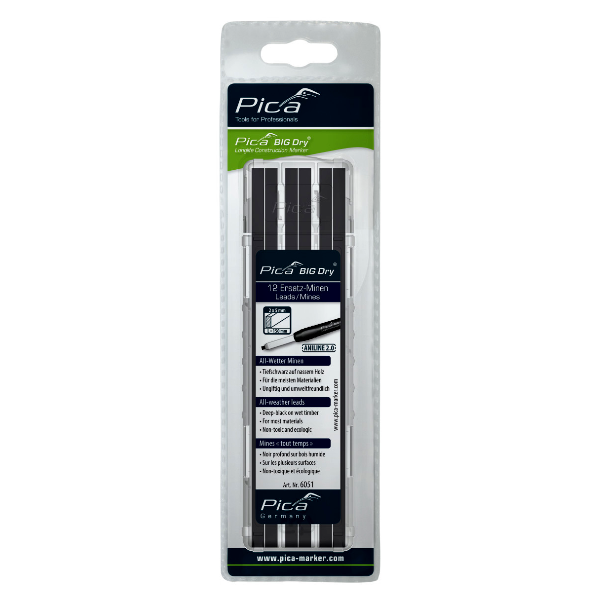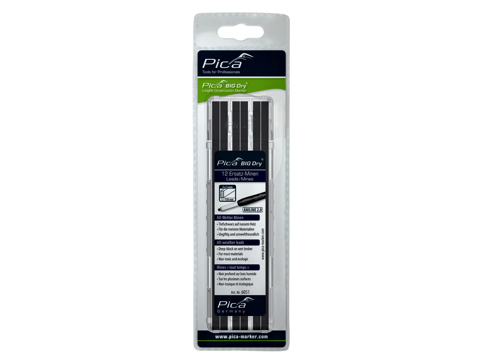 Buborékfóliás csomagolás | 12 utántöltő | Anilin 2.0 tömések | Grafit szín | Pica BIG Dry 6060 kompatibilitás | Erős és biztonságos doboz | Nedves fa munkálatokhoz ideális | Minden időjárási körülményhez alkalmazkodó