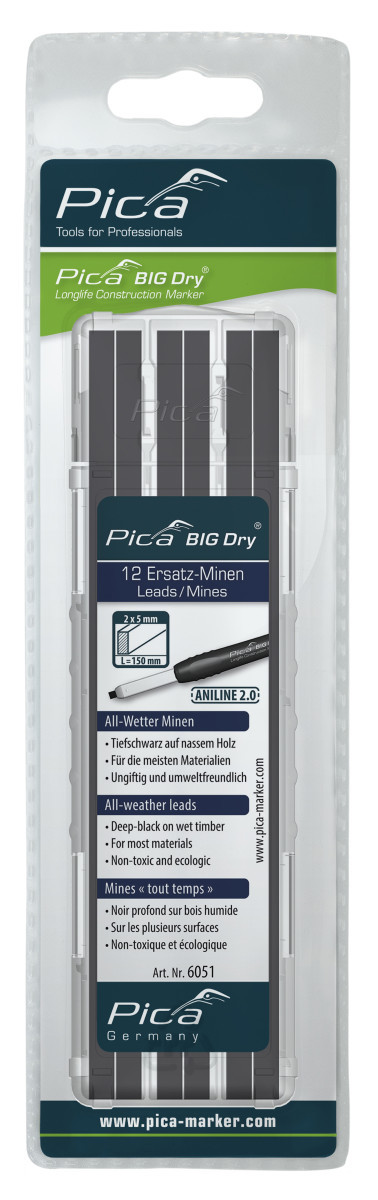 Az asztalos ceruzák az egyik legfontosabb eszközök a faiparban. Miközben a hagyományos ceruzák gyorsan elhasználódhatnak, a Pica BIG Dry utántöltők hosszú élettartamukkal és kiváló minőségükkel tűnnek ki. Használatuk egyszerű és hatékony, így segítenek a legprecízebb munkák elvégzésében is. A különlegesen kemény grafit anyag nem csak nedves fa felületén alkalmazható, hanem más anyagokon is jól látható nyomot hagy. Fedezze fel a minőségi munkavégzés élményét a Pica 6051/SB utántöltőkkel!