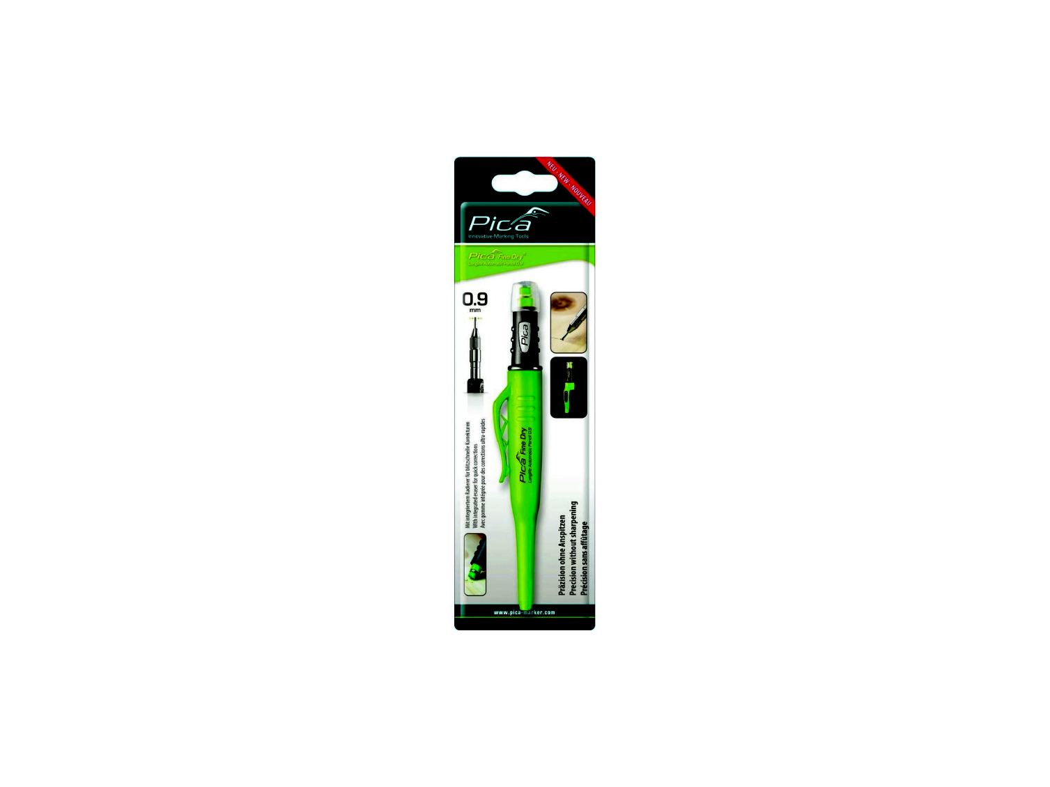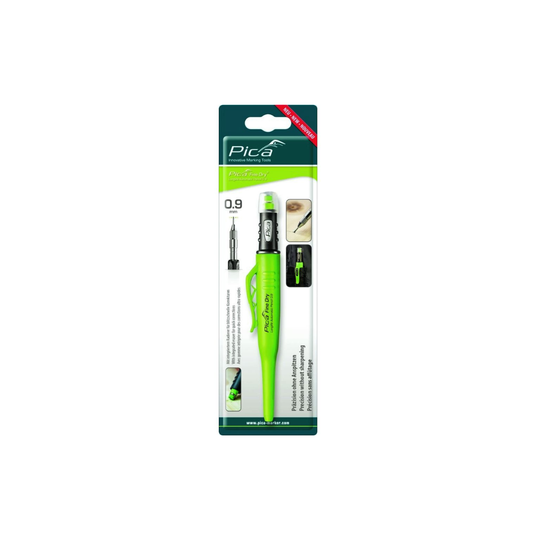 A mindössze 0,9 mm-es speciális hegyátmérővel rendelkező Pica Fine Dry SB jelölő marker tökéletes választás azok számára, akik pontos és finom jelöléseket kívánnak készíteni élezés nélkül. A nagy beépített radír segítségével gyorsan és egyszerűen javíthatóak az esetleges hibák, így időt takarít meg és növeli a munkavégzés hatékonyságát.