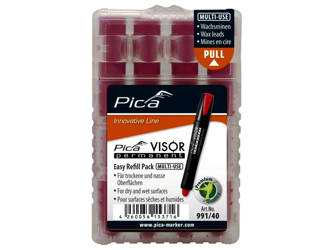 Az intelligens „Easy-Ultratöltő csomagban” található Pica VISOR jelölőkréta utántöltők ideálisak szinte minden anyagfelületen történő vízálló jelöléshez, a fényestől a nagyon durva felületekig. A Pica VISOR állandó Longlife Industrial Marker újratöltésére tökéletesen alkalmasak, biztosítva, hogy soha ne fogyjon el a jelölőanyag még a legnagyobb igénybevétel esetén sem.