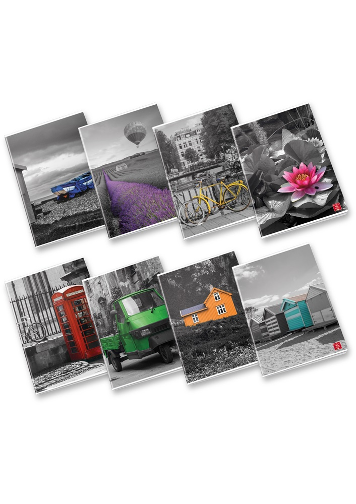 A füzet borítói nyolc különböző mintával érhetők el, mindegyik fekete-fehér fotókat tartalmaz, amelyek vibráló színnel vannak kiemelve. A 205 g/m2 vastagságú borító fényes lakkozással biztosítja a tartósságot és az elegáns megjelenést.