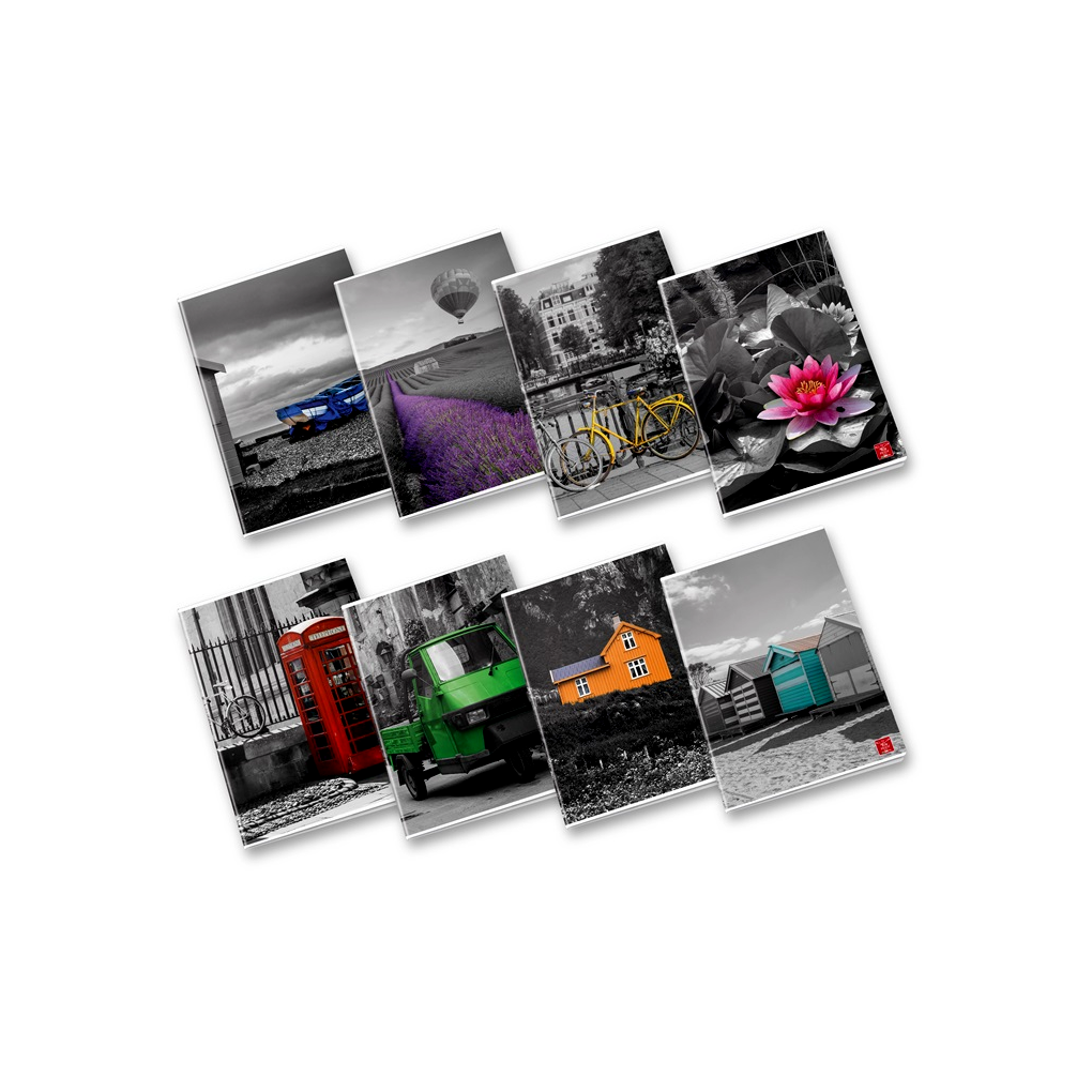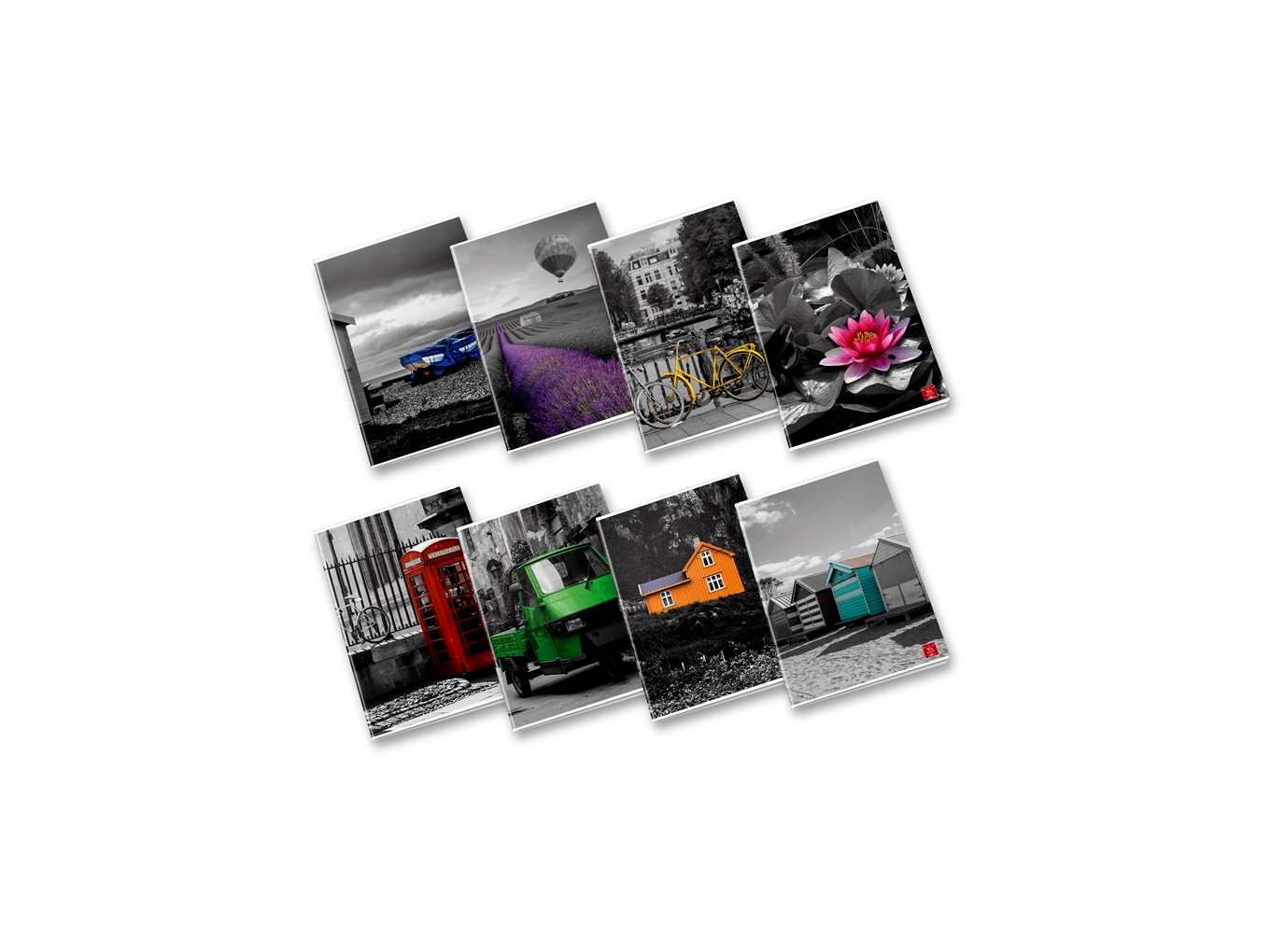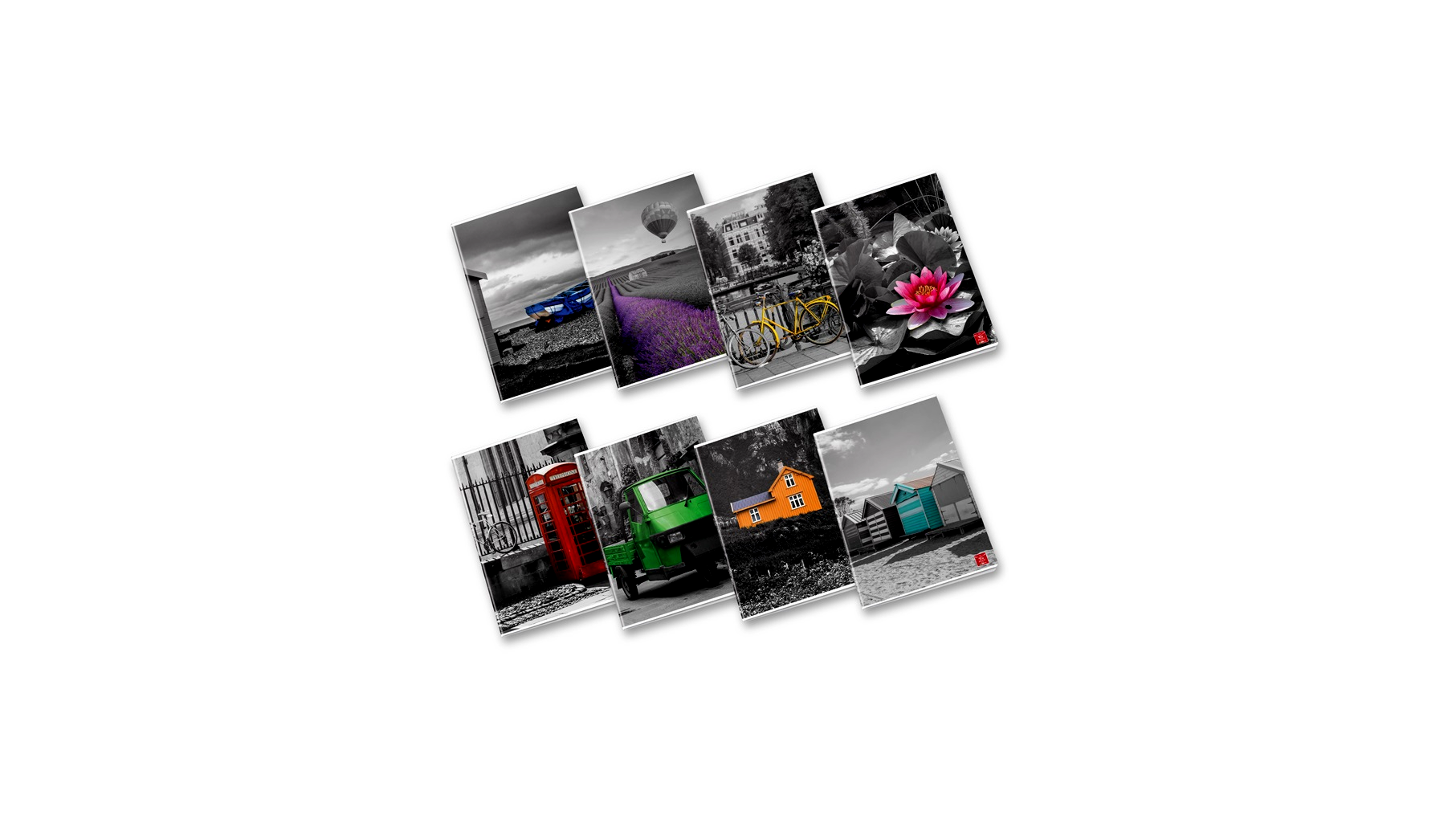 - Különleges dizájn: 8 különböző minta fekete-fehér fotókkal és vibráló színkiemeléssel