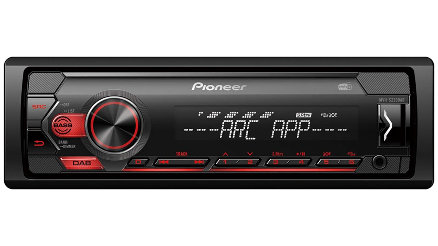 1 DIN fejegység DAB/DAB+ támogatással, piros megvilágítással, USB-vel, Apple és Android kompatibilitással.