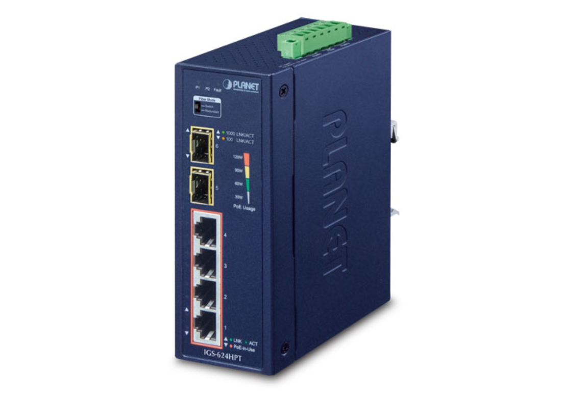 A Plug and Play funkcióval, amelyet nehéz ipari környezetben történő telepítésre terveztek, az IGS-624HPT egy PLANET Industrial-minőségű, DIN-sínes típusú, nem menedzselt Gigabit Ethernet PoE+ kapcsoló négy 10/100/1000BASE-T porttal, IEEE 802.3at PoE+ és két extra 100/1000BASE-X szálas SFP optikai interfész az uplink csatlakozáshoz.