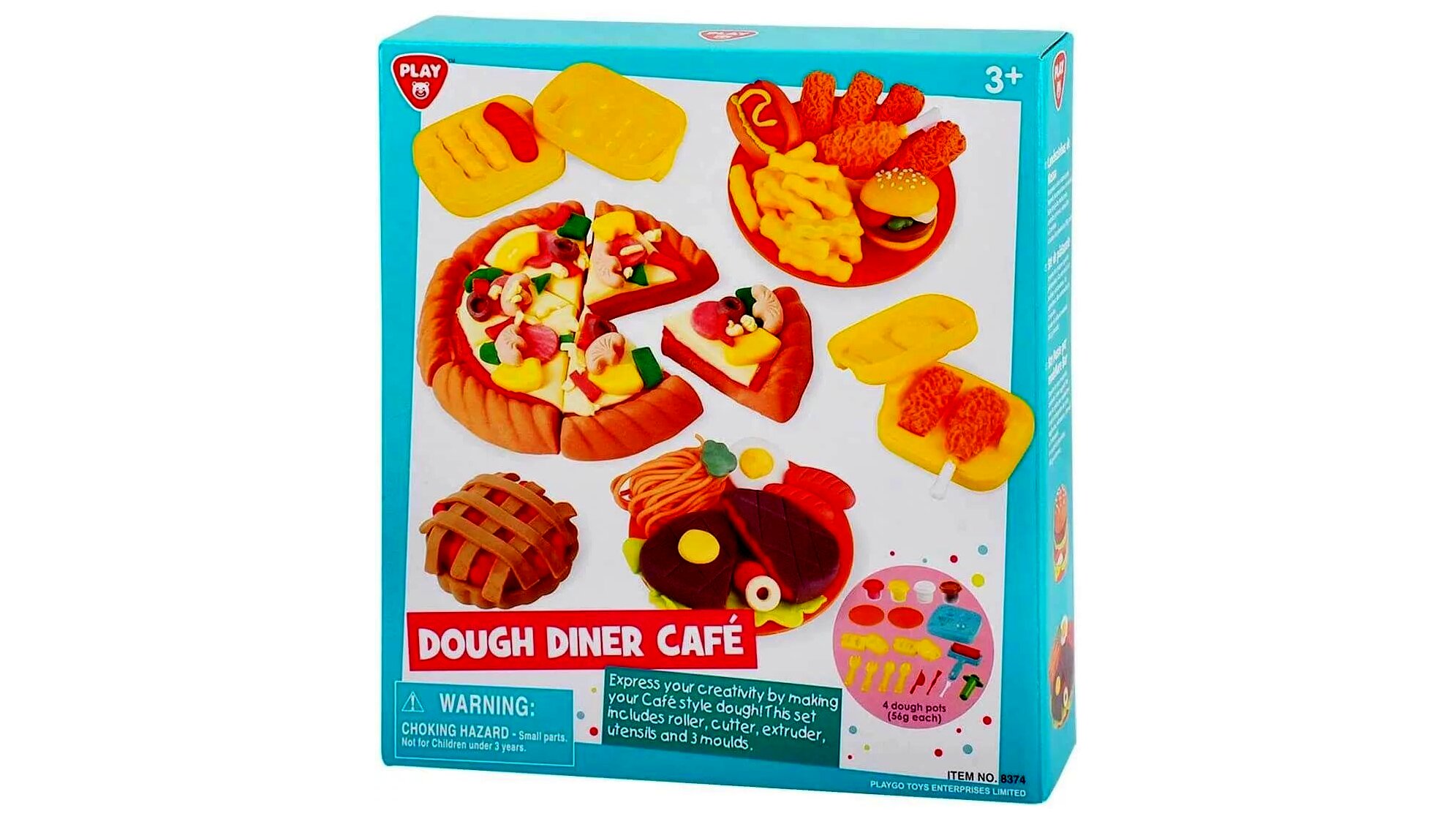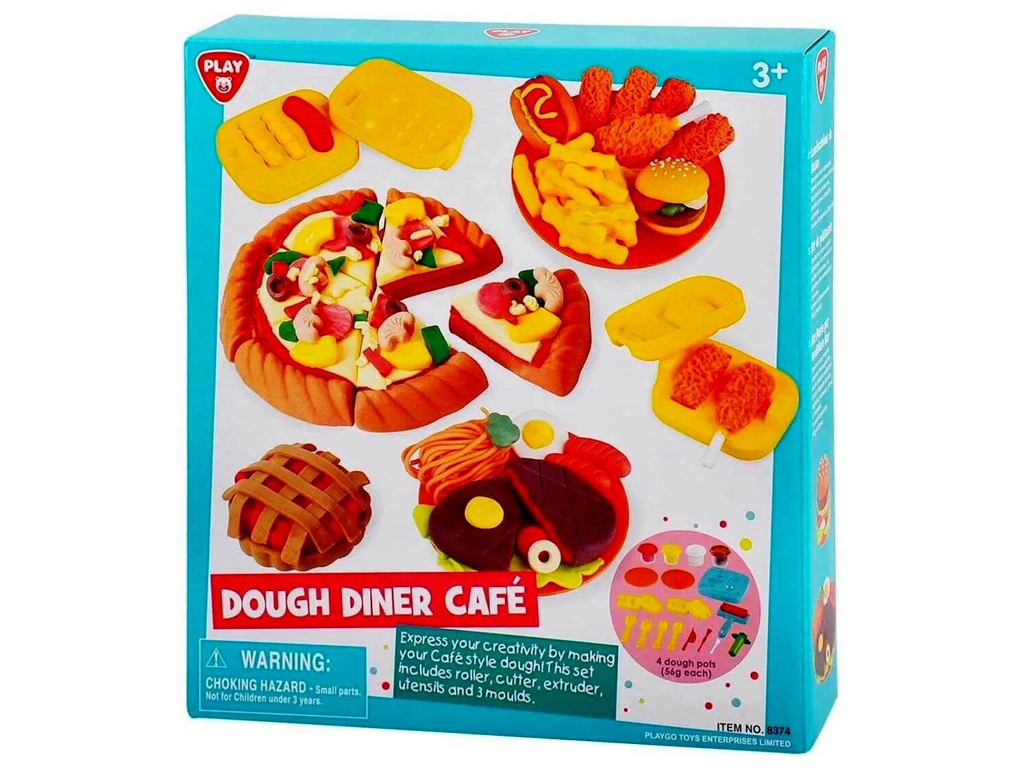 A készletet 3 éves kortól ajánljuk, mely tartalmazza az összes szükséges eszközt a gyurmával való játékhoz: hengert, formázókat és extrudereket. Ezzel a sokszínű készlettel a gyerekek változatos ételeket alkothatnak, legyen szó pizzáról, süteményről vagy akár hamburgerről.